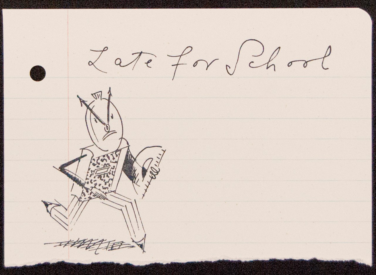 Recto: On realistic looking lined paper there is an illustration of time, with the text "late for school" accompanying it. There are blue and red lines marked vertically and horizontally to illustrate the look of lined paper. There is also a punched hole in the URC to illustrate lined paper as well.