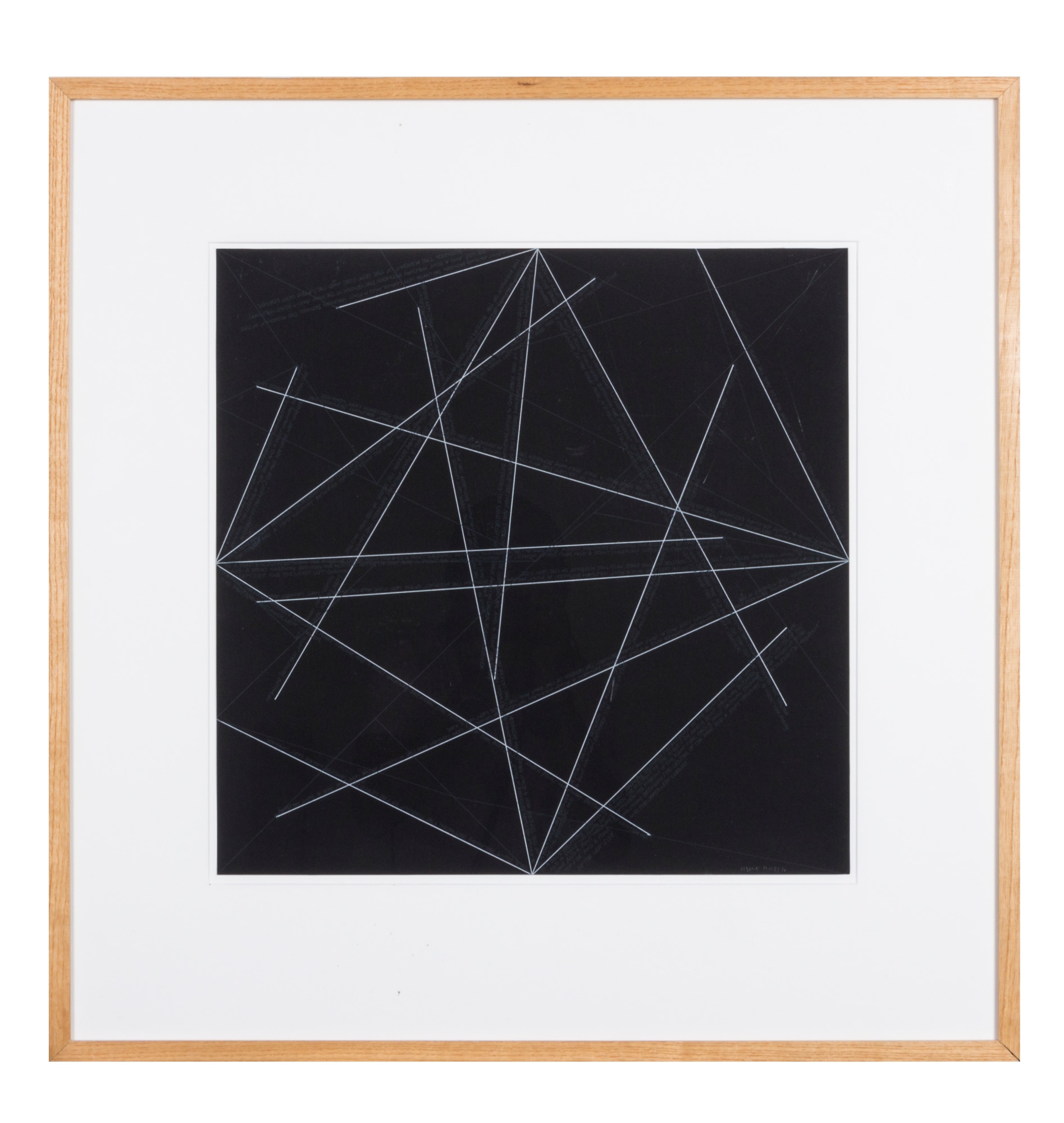 White lines that radiate out from the center of each edge. All but one line terminate before reaching the opposite edge. Dark gray lines crisscross the entire composition. Dark gray text that describes the location of the white line above it. Everything is set against a black background.