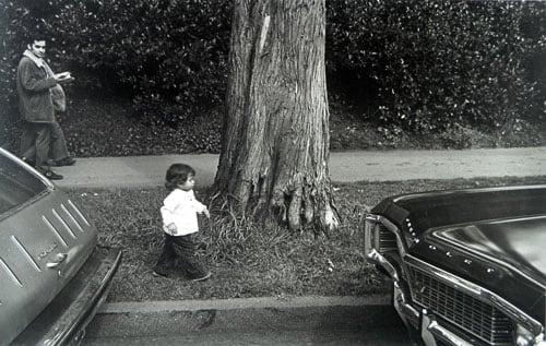 Black-and-white image of a toddler running on the grass part of a sidewalk. The child is in-between two cars parked on the side of the street.