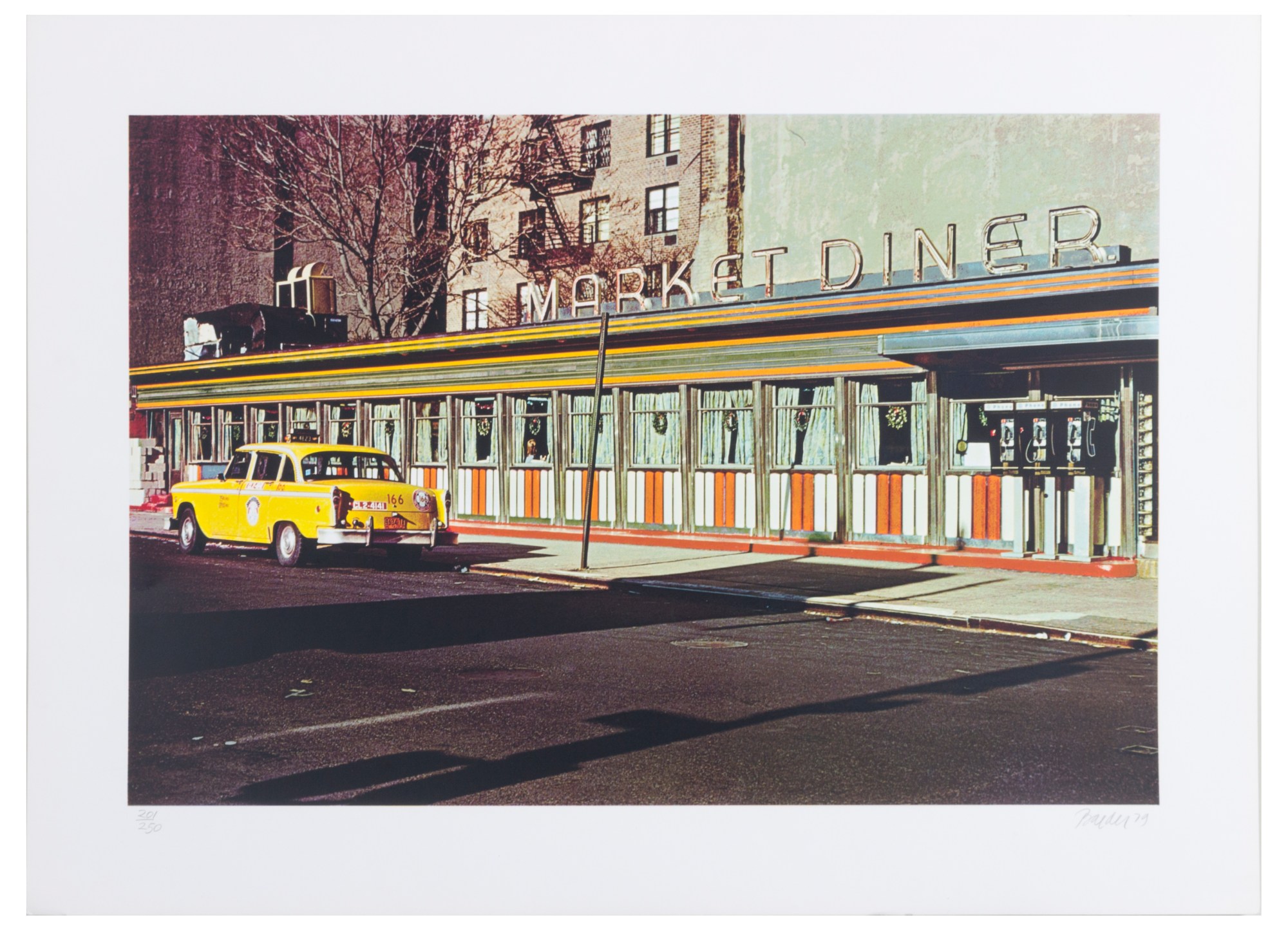 Print of diner from street, names "Market Diner", a yellow taxi is on the street. Colors include teal, yellow, and red.