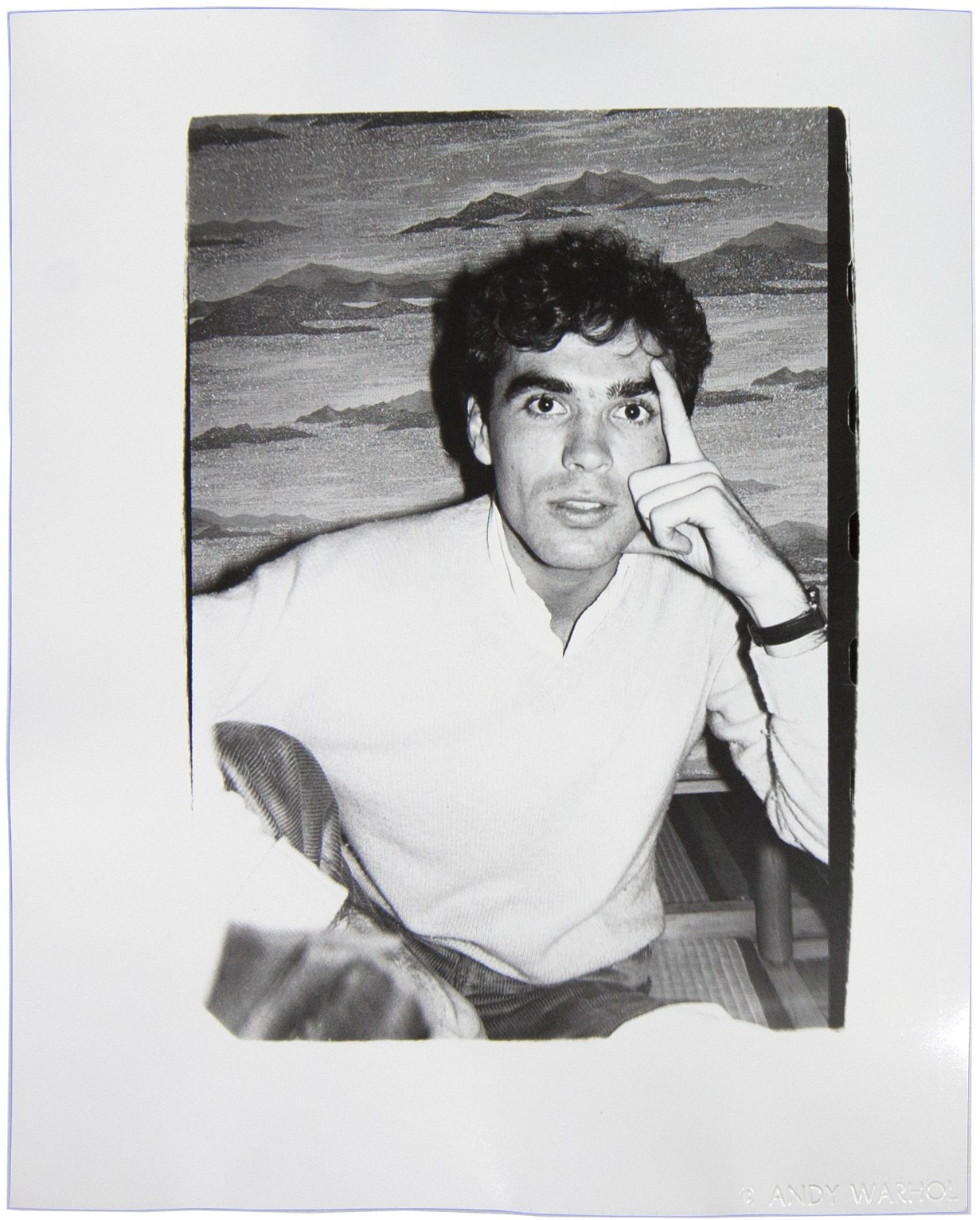 Black-and-white image, uneven masking line, of Sean McKeon sitting on the floor with his left hand to his face. He's wearing a sweater and corduroy pants. The sprocket holes of the film are visible on the right side of the image.