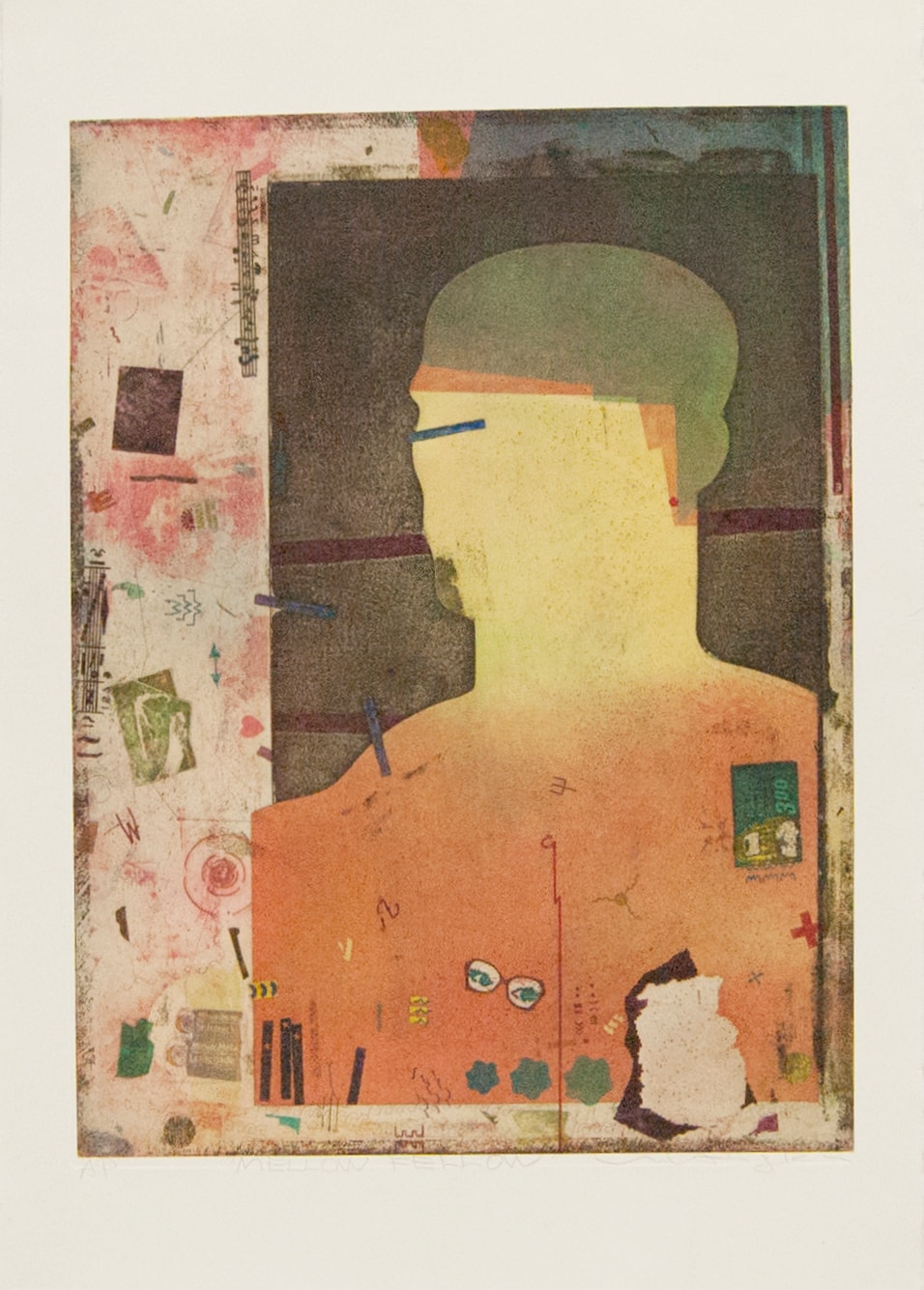 A figure, who is set against two backgrounds takes up most of the image. The colors of the figure are a gradient green to yellow to rust red. On top of the red portion, there are little graphics illustrated - ex. a pair of glasses and some symbols. The first background to the figure surrounds its head. It's coloring is primarily black with clear undertones of magenta and yellow and green. Blue bars intersect with this background. The second background takes up the rest of the plate. It is multi colored. It too is filled with symbols and references, such as, minute maid lemonade in the LLC. Other symbols include waves, a heart, and music scales.