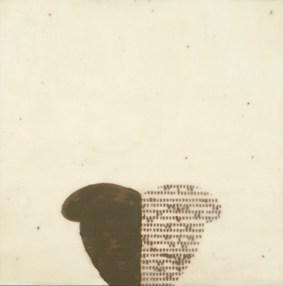 Abstract image. Locate in the center bottom is a fish tale shape. Half of the shape is a solid olive color( on top of encaustic layer) and the other side is made with various sized vertical hatch lines (below the encaustic layer). The background is speckled . The encaustic layer is a pale yellow color and has a matte finish.