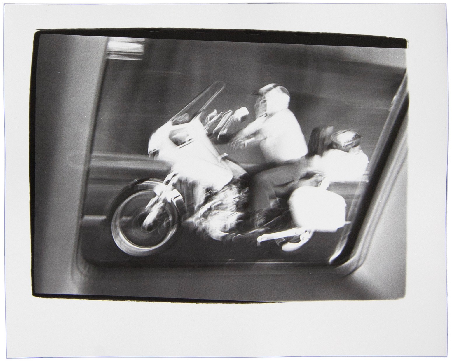 Black-and-white image, uneven masking line, of a person on a moving motorcycle (possibly a policeman). The image was taking through the window of a moving vehicle so the it is blurry.