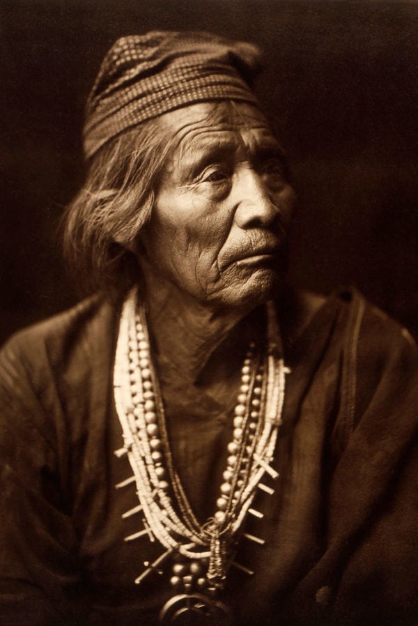 A restrike print from copyright photograph 1904 by Edward L. Curtis' photograph, Nesjaja Hatali- Navajo. The image is a 3/4 bust portrait of a Navajo Native American. He's wearing a bandana and several silver and shell necklaces. Printed under the image is a text that reads: " Nesjaja Hatali- Navajo" from copyright photograph. 19904 by E.L. Curtis" Photogravure John Andrew and Son". In the larger margin around the image is an "E.S.Curtis" watermark. Lower right "CG" water mark