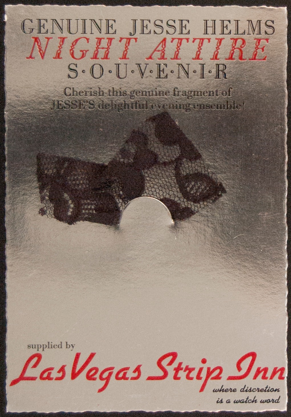 Recto: black and red text is set against a silver background. It reads "Genuine Jesse Helms Night Attire souvenir. Cherish this genuine fragment of Jesse's delightful evening ensemble. Supplied by Las Vegas Strip Inn, where discretion is a watch word." Verso: Text shares information on artist, image, and printer. Piece of fabric included.