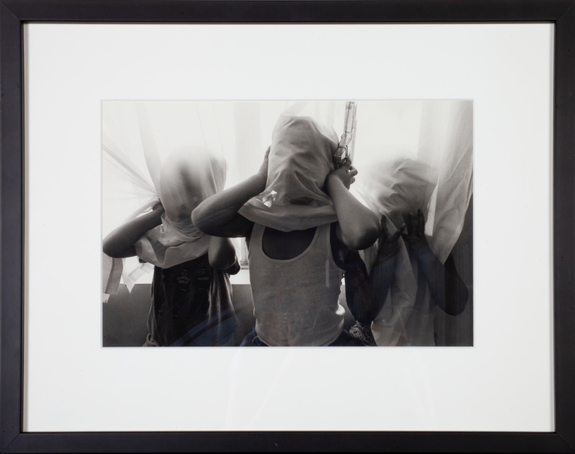 Black-and-white photo of three young boys covering the pulling a sheer curtain over their faces.