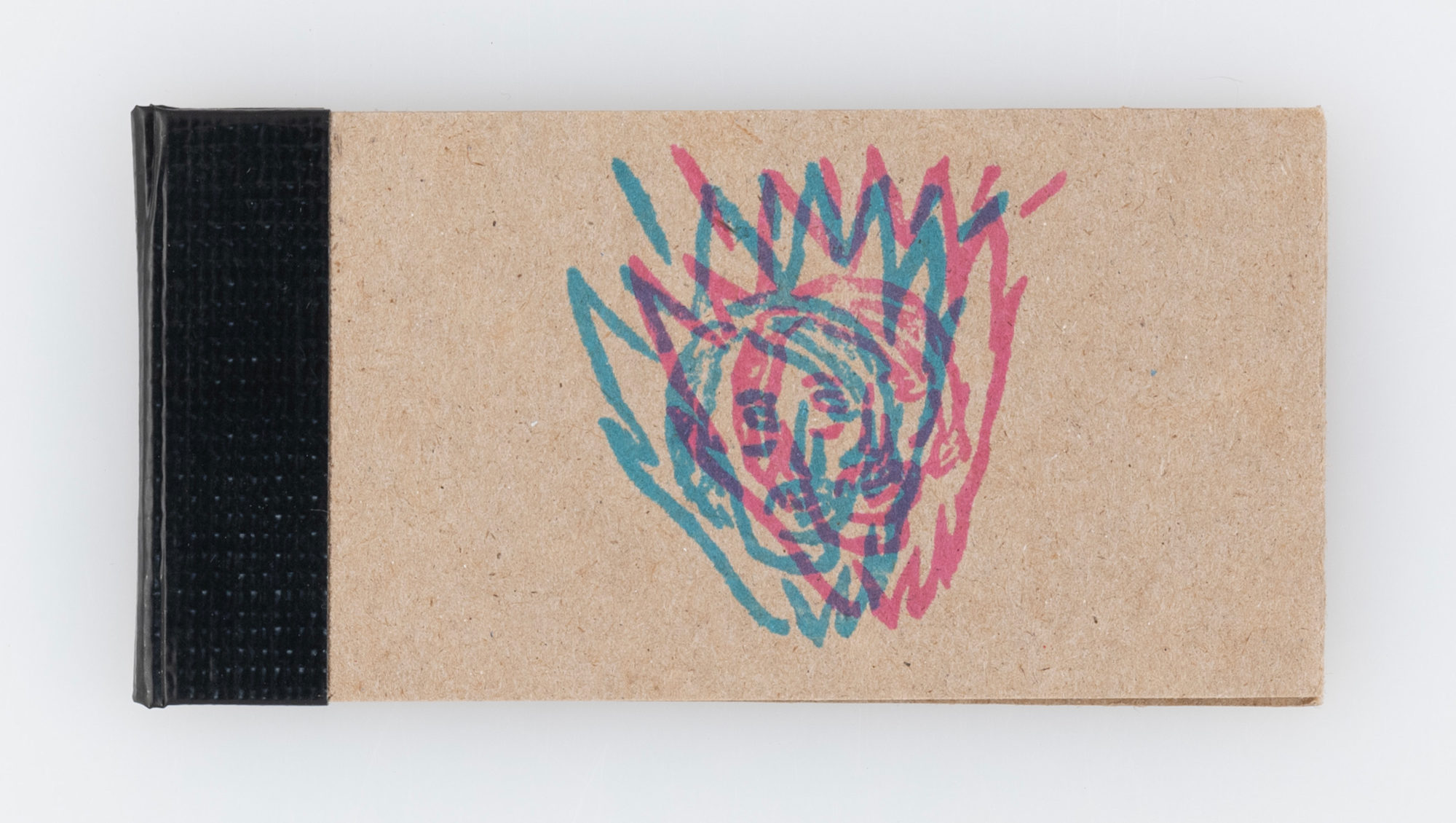 Folded book with perforated fore-edges, pages gathered and duct-taped to bind. Brightly colored images on both sides of paper with some text. Cardboard wraps with stamped face in flames.