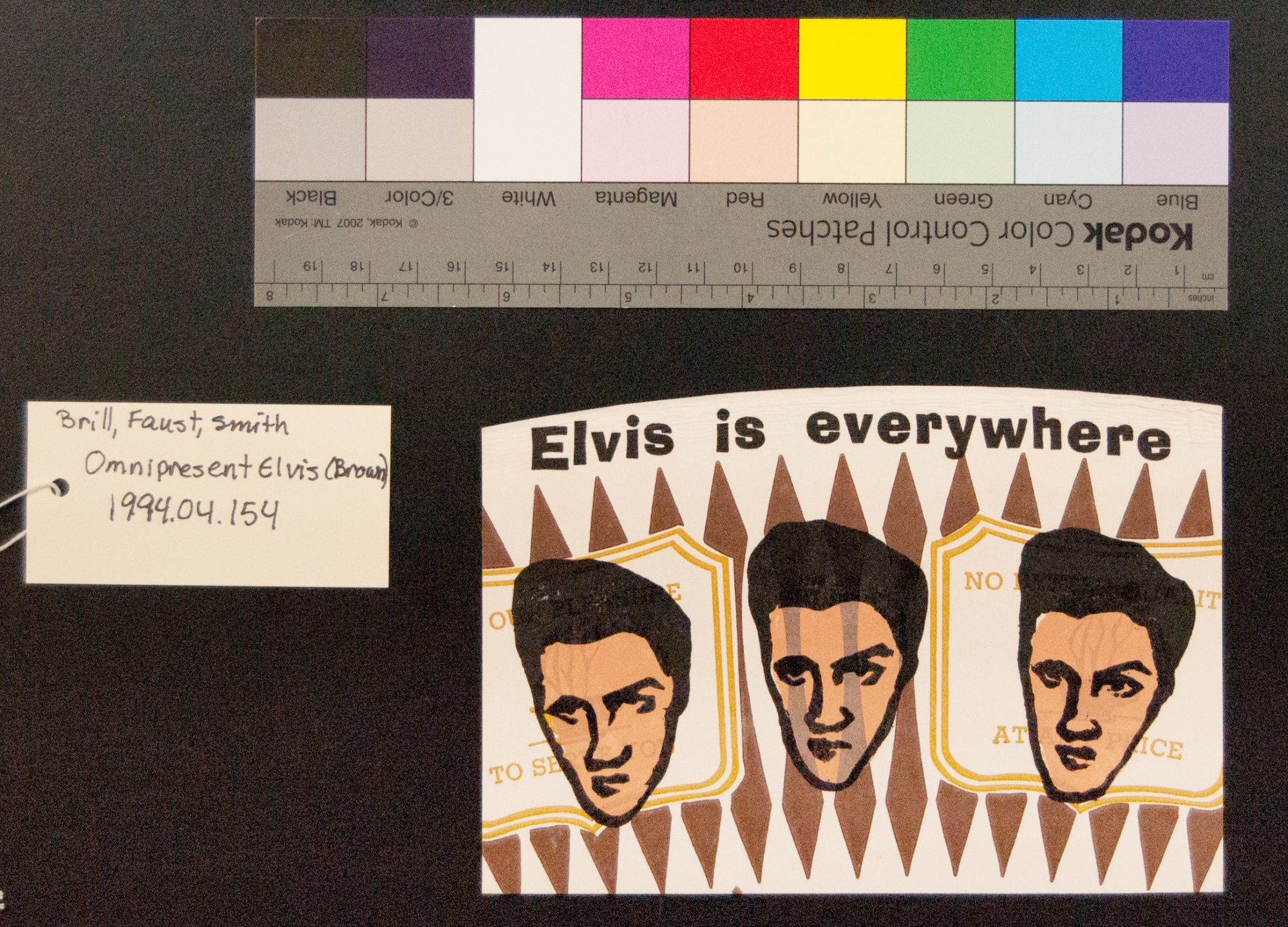 Recto: Double pointed shapes arranged side by side along the entire surface badge-like shapes with the Sherri & Price drink logo are on the left and right of composition and a series of 3, two toned Elvis Presley heads, printed on top of the designs of the cup