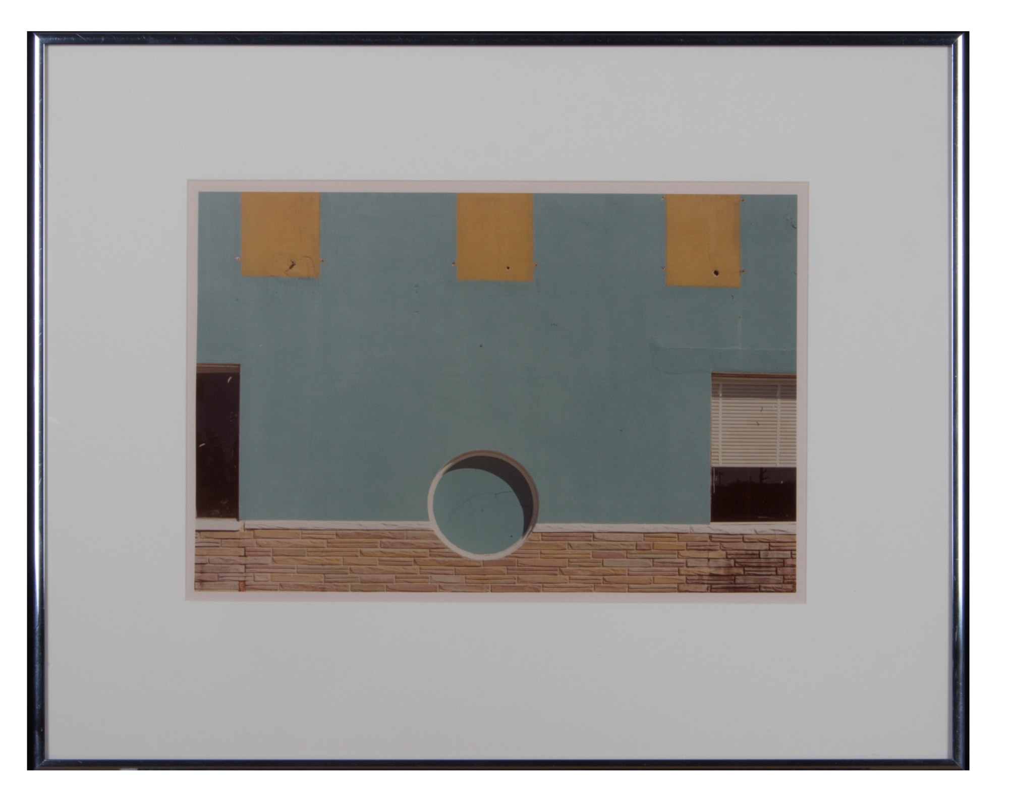 Image of the outside wall if a building. The wall is bright turquoise with 3 yellow rectangles on the top edge. There's a window on the left and right edge side if the composition