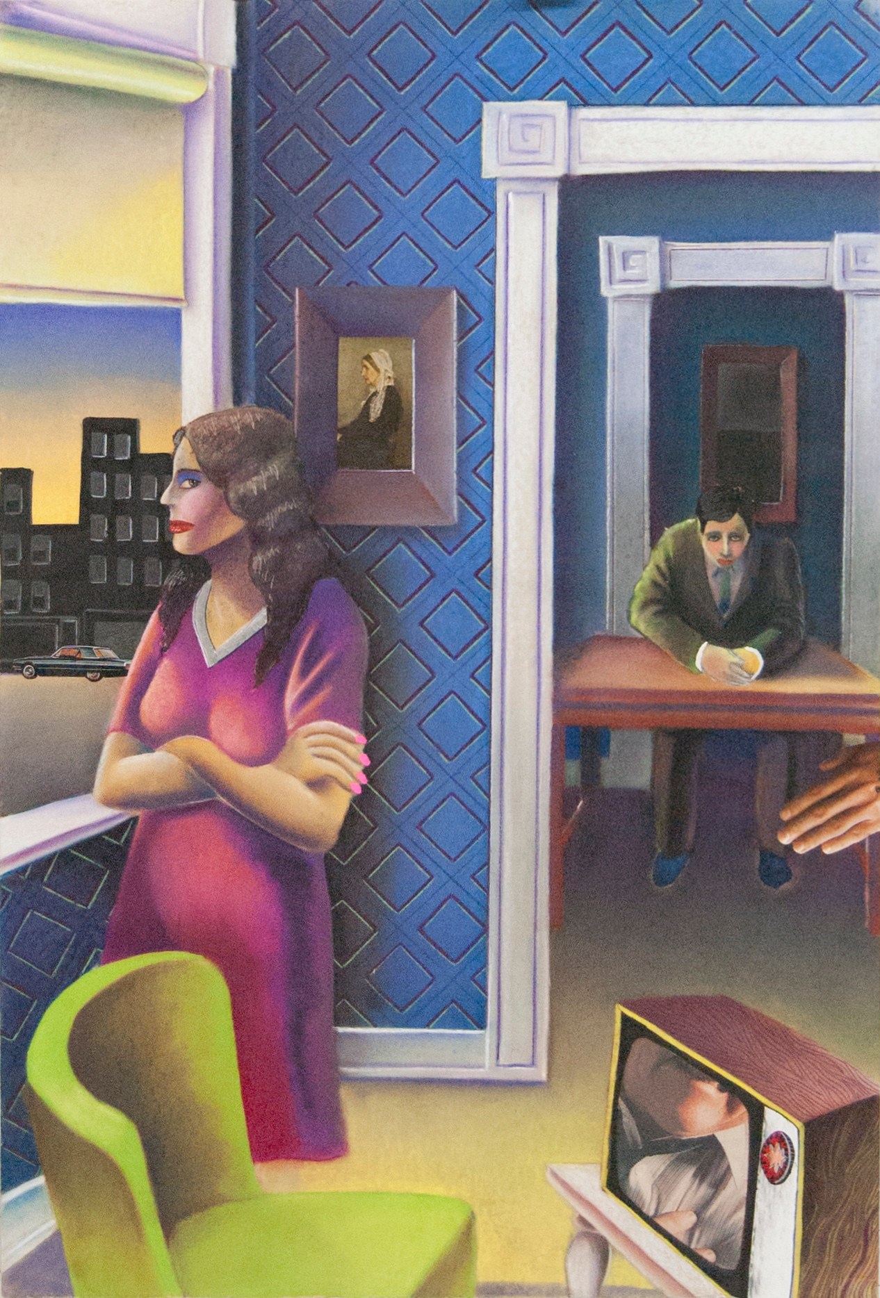Drawing is a seamless mix of drawing and collage. Woman looking our a window, and a man sitting at a table in the hallway. There is a TV and stand in the foreground. A disembodied collaged hand is extending from the right center edge. Smooth texture, but areas that are collages are raised.