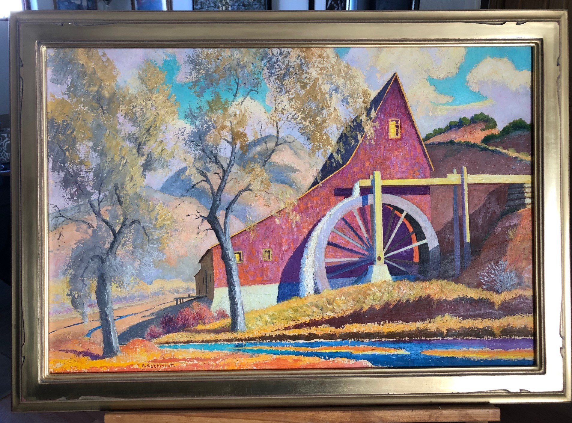Pojoaque Mill - Autumn shows an oil painting of a red barn in a forest setting.
