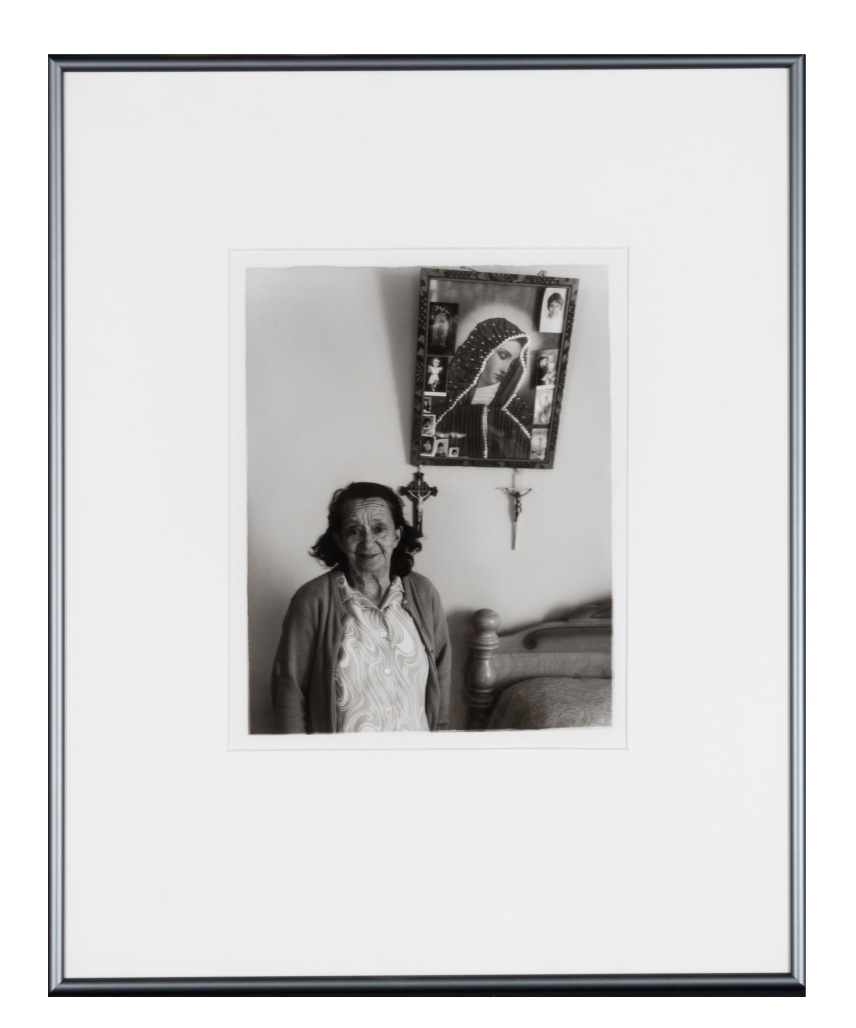 image of an old woman in a room. Behind her is a portrait of the Virgin Mary and two crucifixes hanging above a bed.