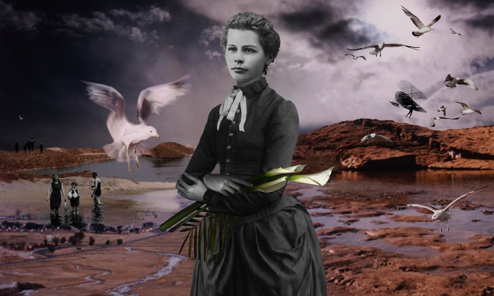 Digital collage depicting a surreal landscape of a beach patch worked with a valley scene. There are black-and-white images of Victorian people that are surrounded by seagulls.