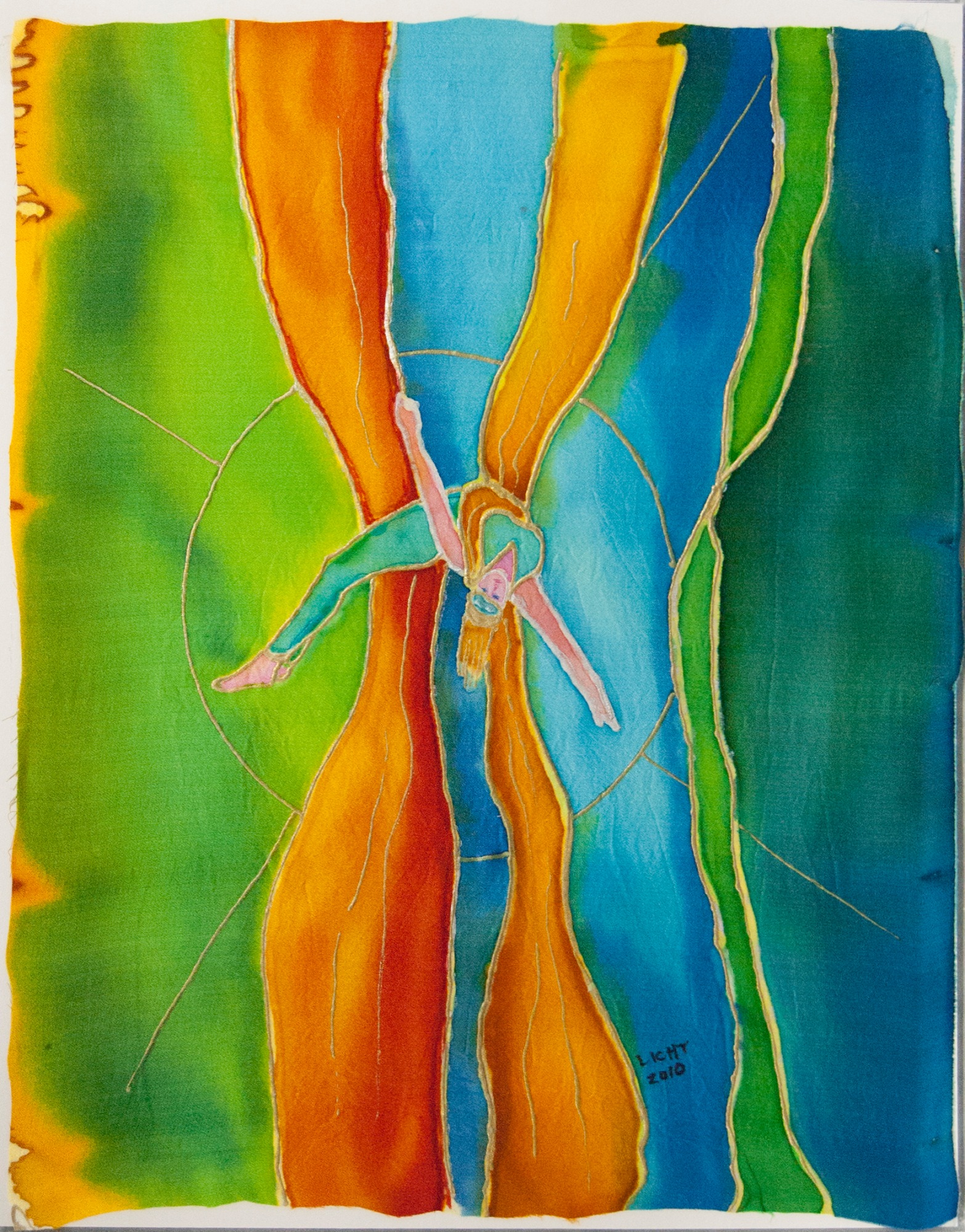 A ribbon dancer performing against a blue and green backdrop. The figure and the ribbons are outlined in puffy paint. The background has a circle with four lines radiating out in puffy paint.
