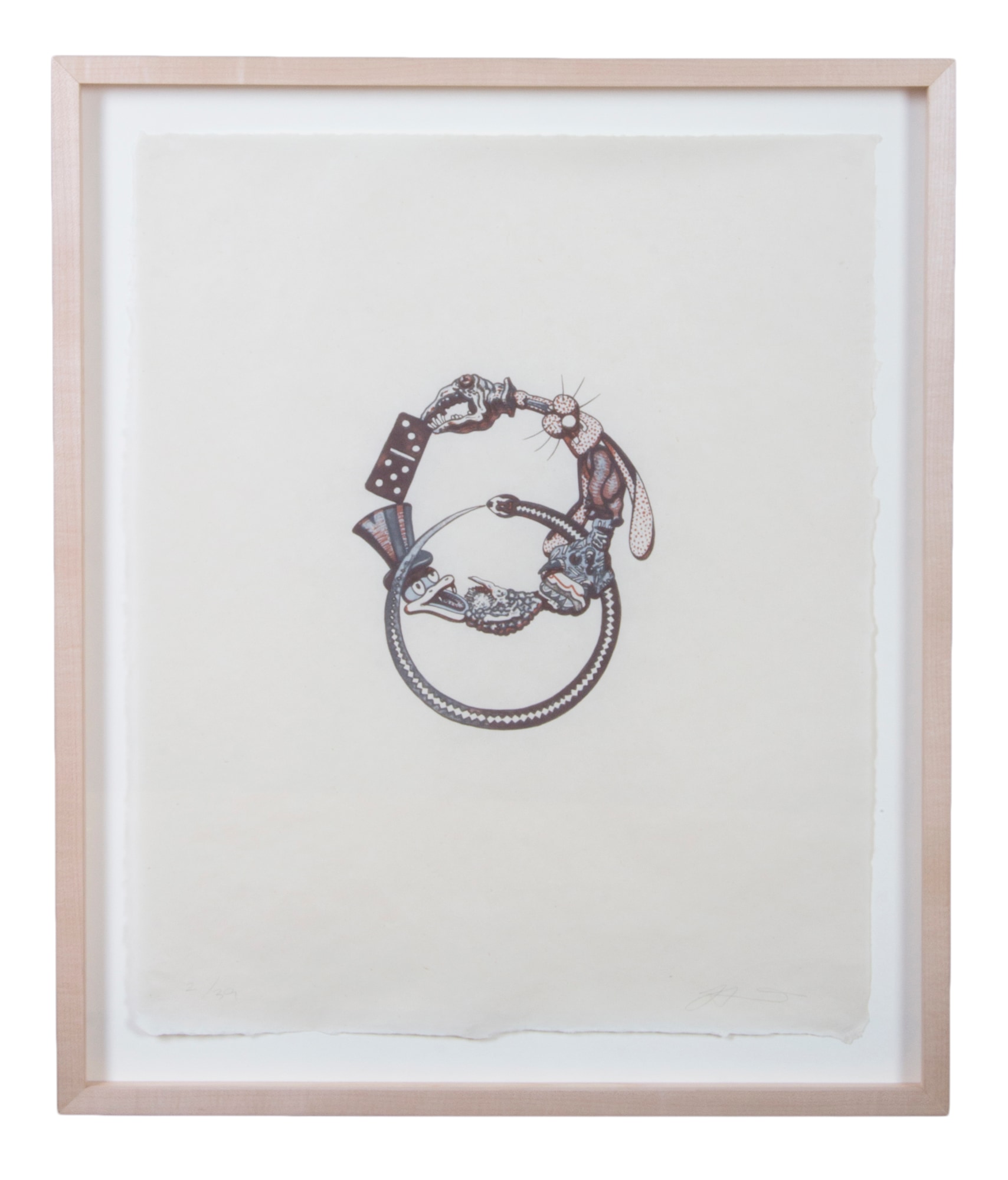Two rings overlapping at their mid points. The top ring is made of a cartoon duck, a Mexican mask, a domino, and cartoon fly. The bottom ring is a snake biting its tail.