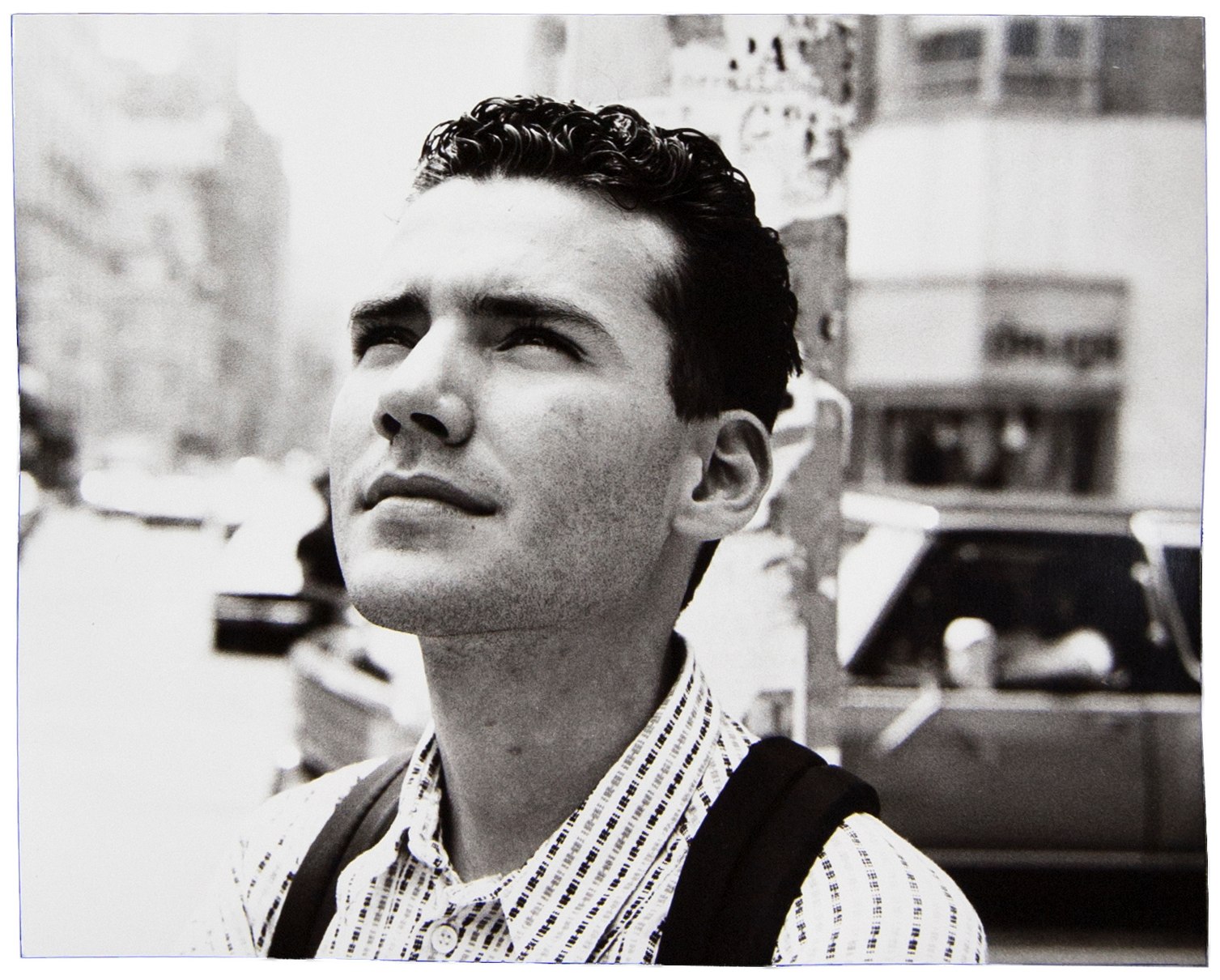 Black-and-white, borderless image , 3/4 bust portrait of artist (jeweler) Wilfredo Rosado. Rosado is looking up at the sky, squinting. He has short curly hair and wearing a patterned shirt and solid vest.