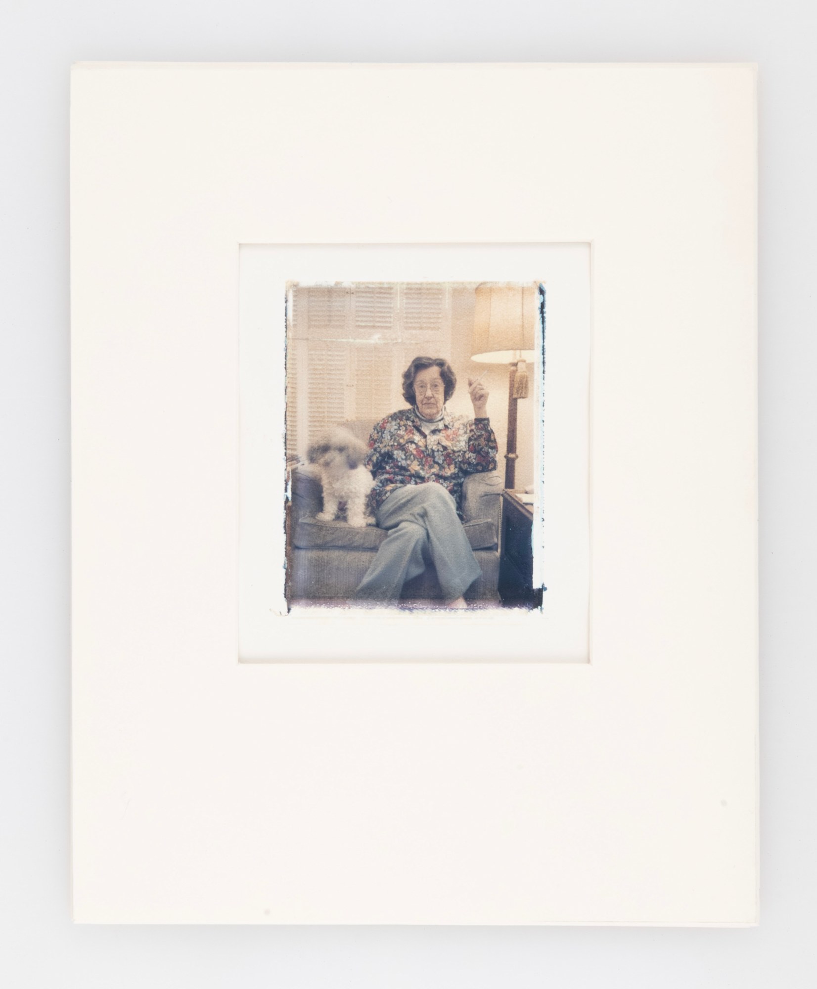 The surface is slightly texture, and has a matte finish. Portrait of an elderly woman (Ruth) sitting on an armchair, smoking a cigarette, flanked by a dog to her left and a lamp to her right. The background is of windows with the white wooden blinds, closed. The edged of the images are rough and outlined by broken lines of various colors.