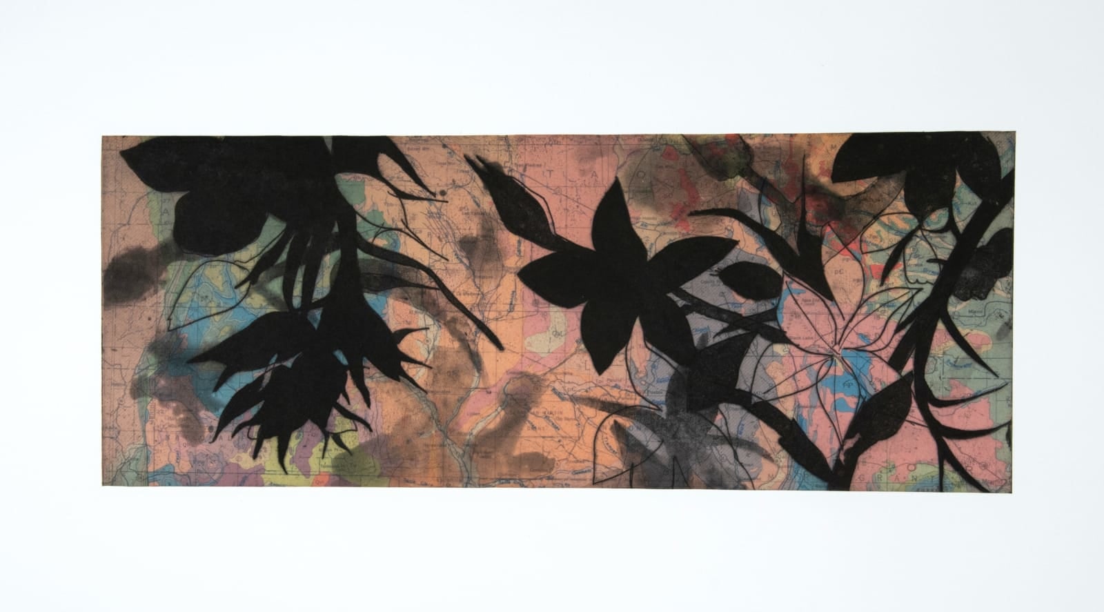 Multicolored map background, with black rubbing of foliage as the foreground.