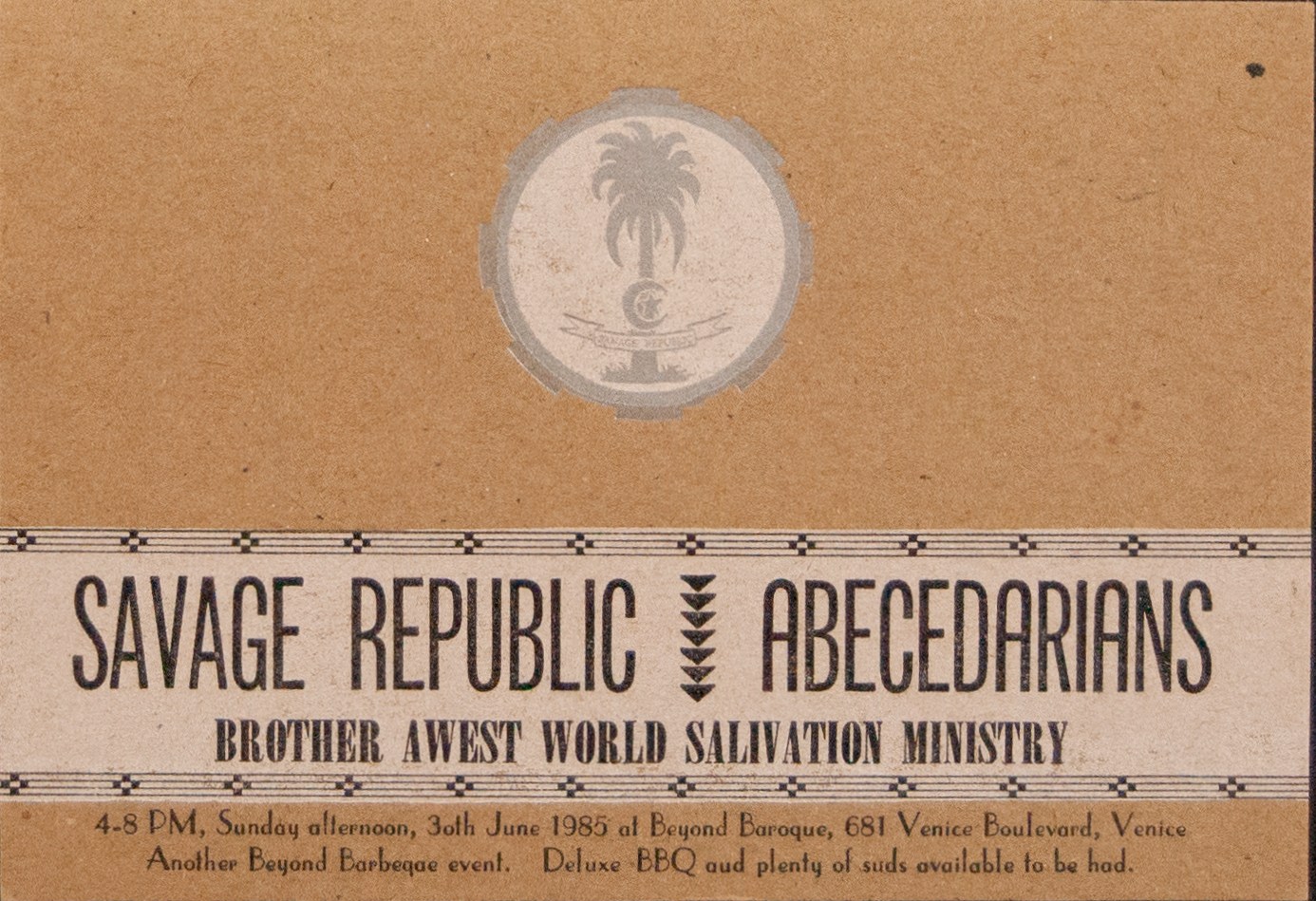 Flat card is an advertisement for a concert featuring the band Savage Republic. The top half of the card is the bands logo:a palm tree, crescent moon and star followed by a banner with the bands name on it, all encircled by a cog. Bottom half is text, the most prominent being the names of the band which are in a decorative white banner accented with geometric designs.
