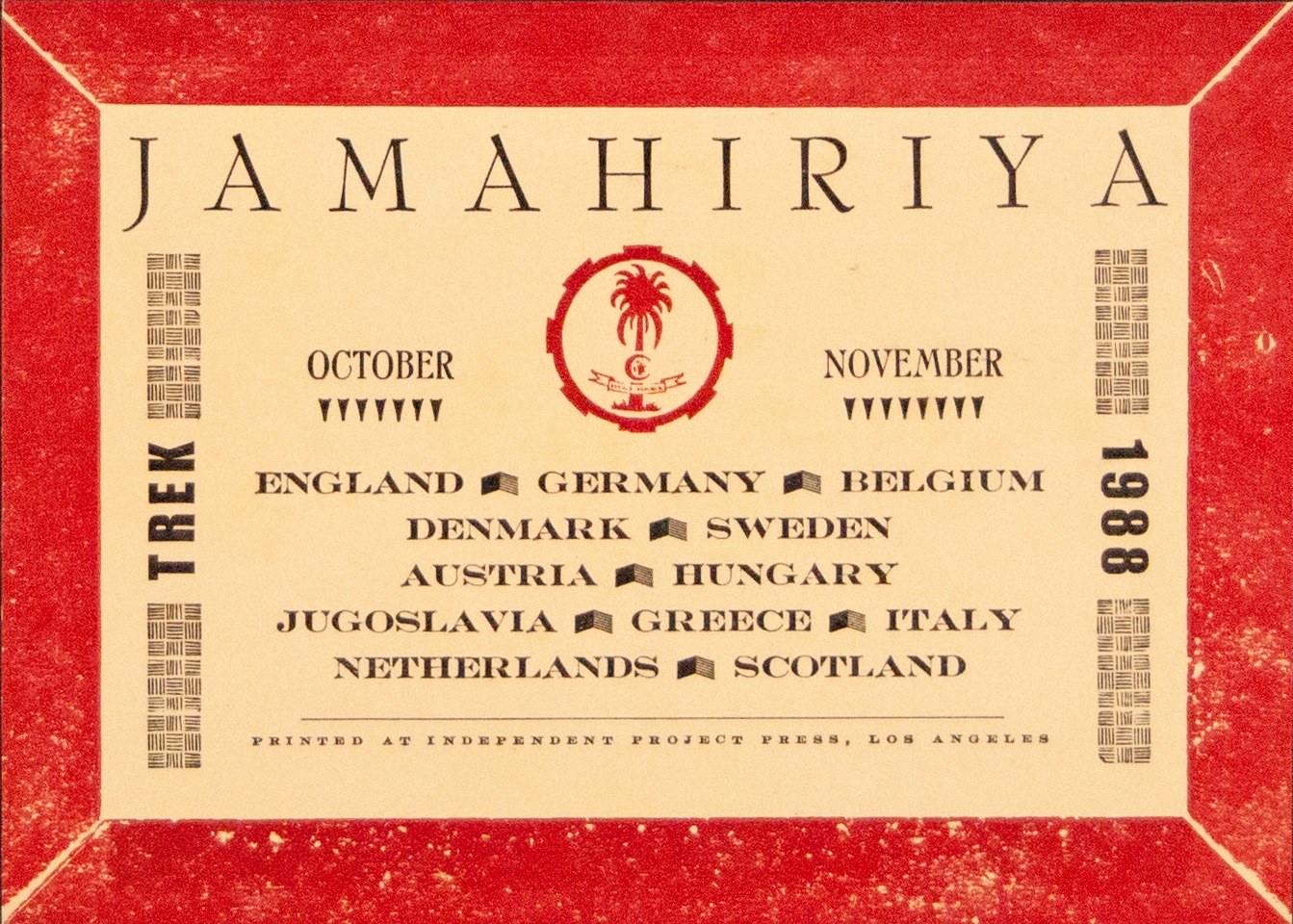 Promotional postcard for the band, Savage Republic's 1988 Jamahiriya tour. Red border surrounds the text that include the name of the tour, months, year and countries the band would be performing in.