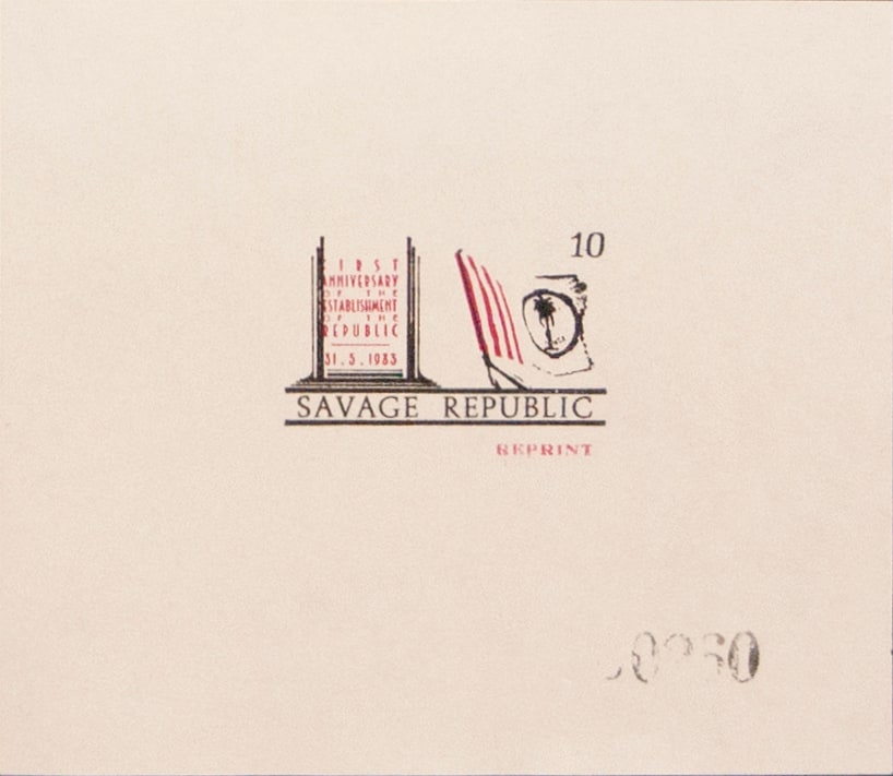 Print is the logo for the band Savage Republic. Imagery includes a flag with 4 vertical red stripes and an encircled palm tree. To the left of flag is a column that reads, "First Anniversary of the establishment of the republic 31.5.1983." Lower right is a stamp with a series of numbers.