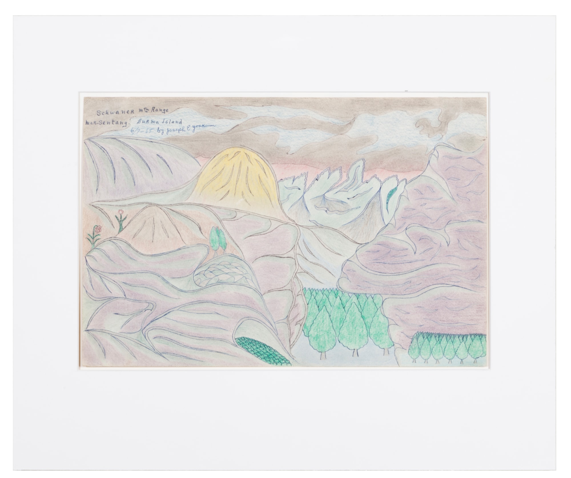 Recto: drawing: landscape drawing, depicting a mountain range. Colors: yellow, purple, green, blue, red, brown.