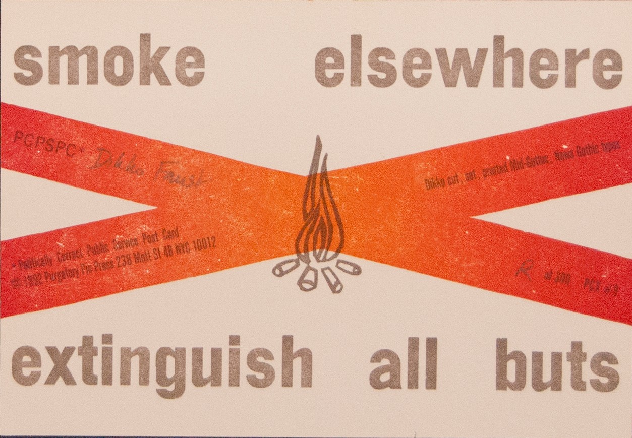 Recto: graphic campfire with a red "X" passing over it. Taupe text reads "Smoke elsewhere extinguish all buts." Text on the "X" provides additional information about the piece.