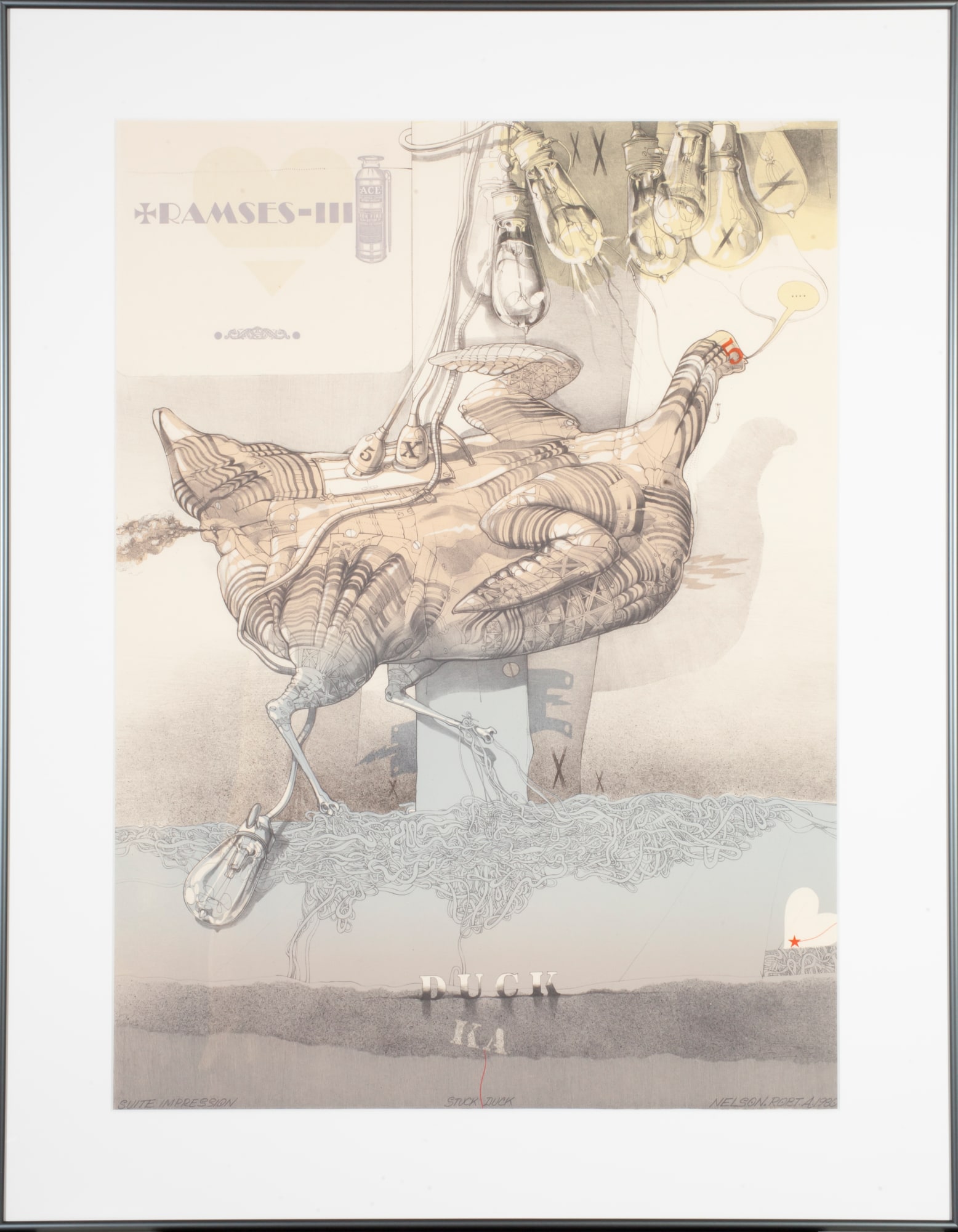 Surreal image of a featherless, footless, and headless duck is in the center of the composition. There are a cluster of Edison light bulbs in the top right corner and they are plugged into electric plugs on the ducks back. Below the duck is a tangle of wires that seem to be flowing out of the duck's ankles. The wires end at font that reads "Duck" and "Ra". Text in the upper left corner reads " Ramses III"