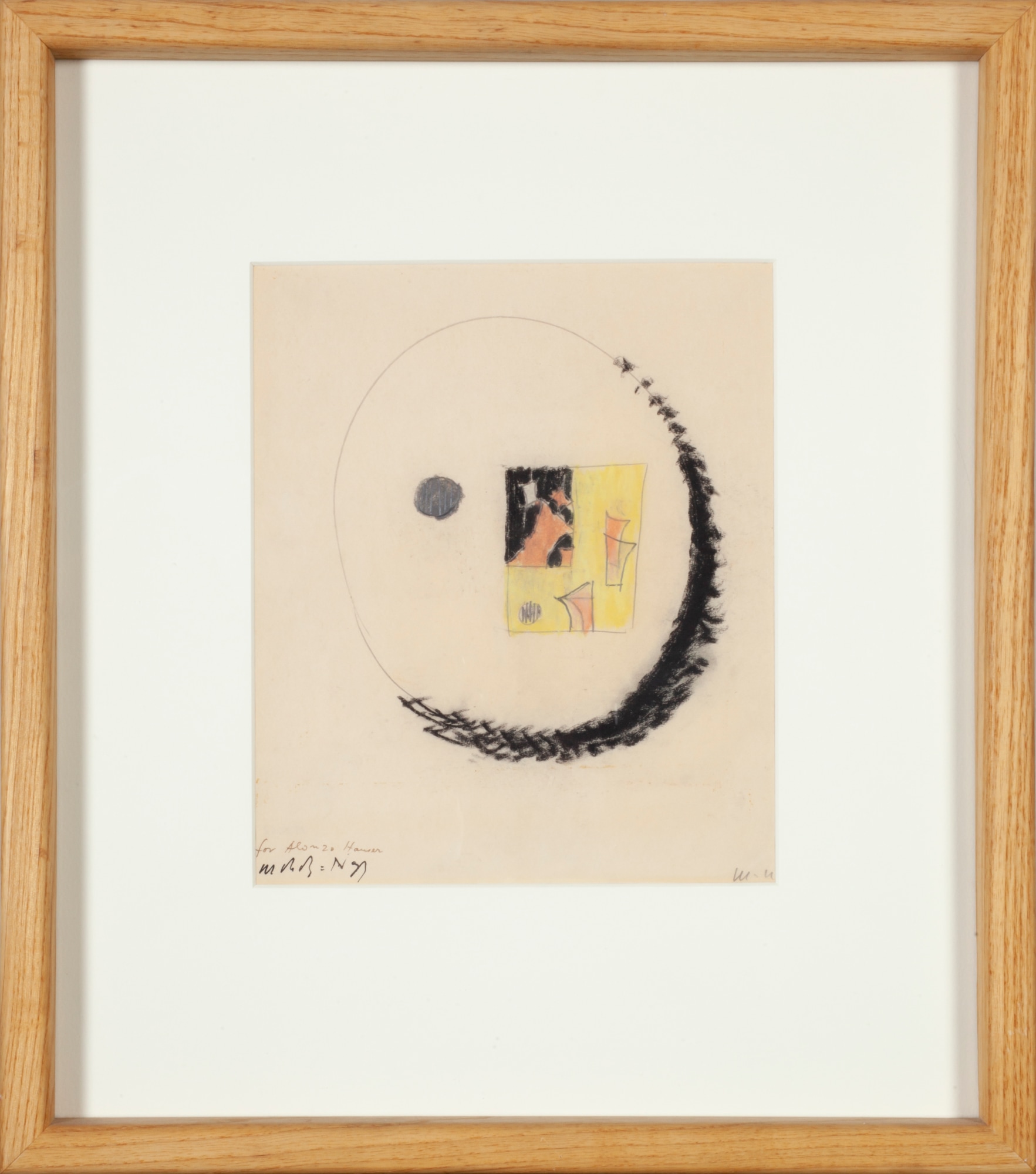 Geometric abstract composition. An irregular oval shape drawn in pencil. Along the right outer edge there are black marks that make a crescents shape. To the right of the circle is a vertically oriented, yellow "L shape" w/black and pink quadrilateral shapes decorating the interior.