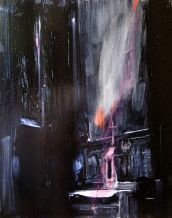 Dark image of a cathedral facade. Painterly brush strokes suggest the surfaces of the dimly lit walls within the church.