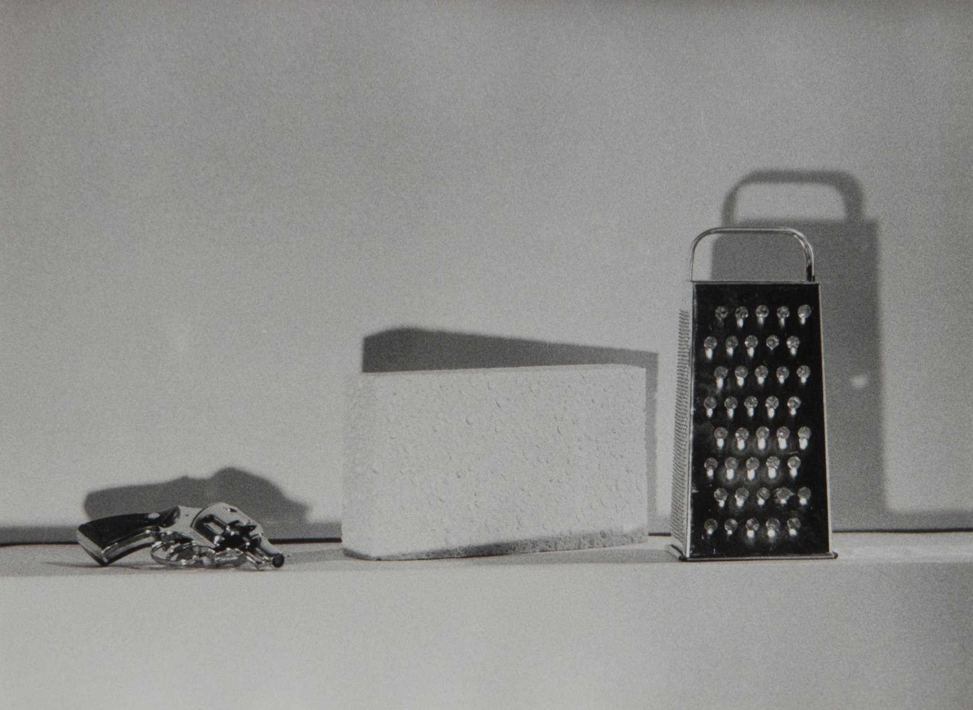 Black-and-white still life image of a table setting that includes (from left to right) a revolver gun, a dish sponge and a cheese grater. The surface and background are white.