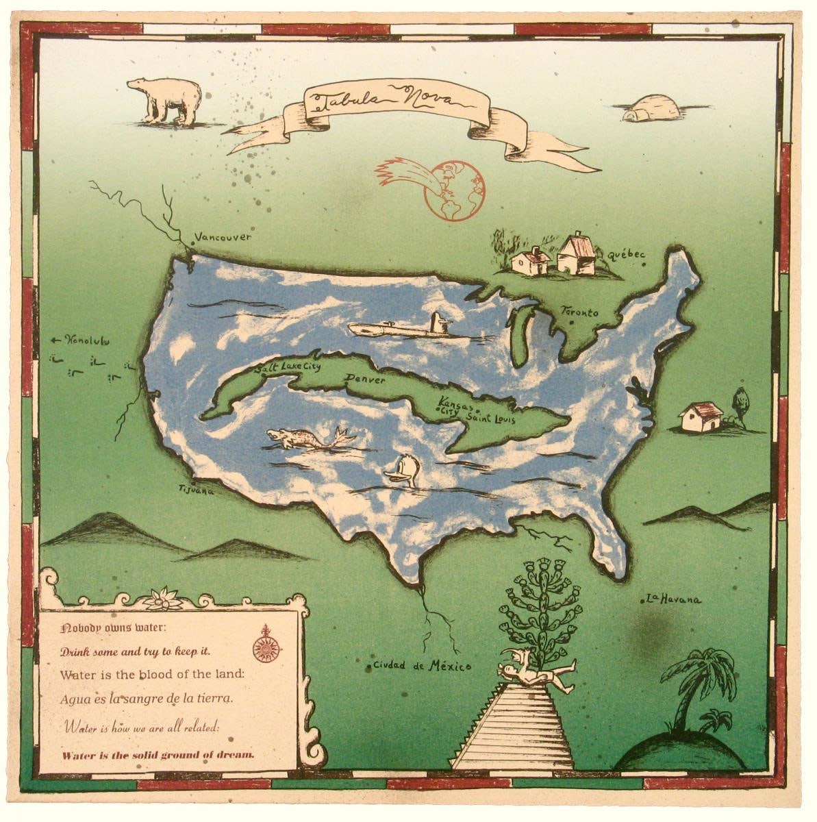 A stylized map of the Unite States of America in which the land is ocean with an island in the midd of it. There is land surrounding the water. There are various illustration around the map, including a banner at the top center, and a key in the bottom left corner. There are two borders around the composition that were designed to look like scale bars on a map.