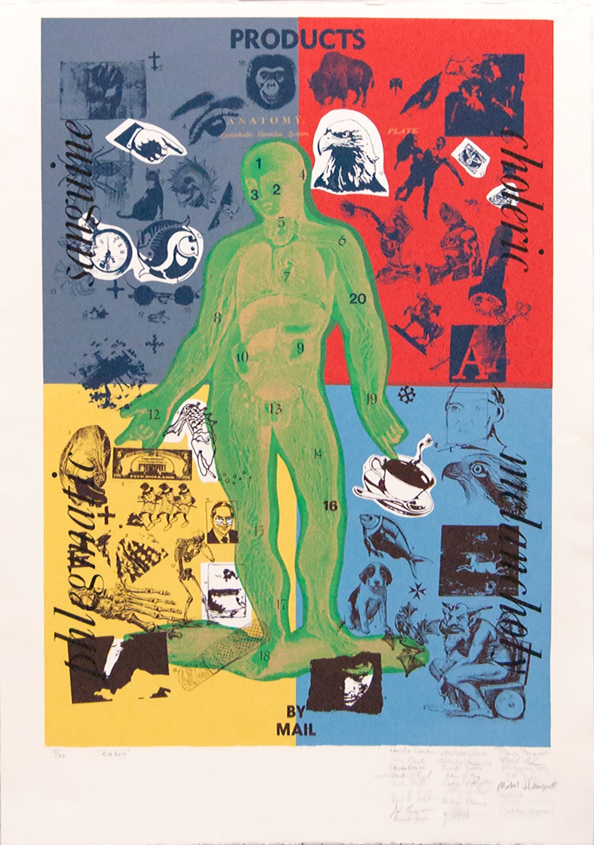 An interpretation of 16/17 century four humors made up of multiple graphic illustrated images. Each affliction is color coded, and all four intersected by a green and yellow rendering of a male figure. The four humors identified as sanguine, choleric, melancholy, and phlegmatic