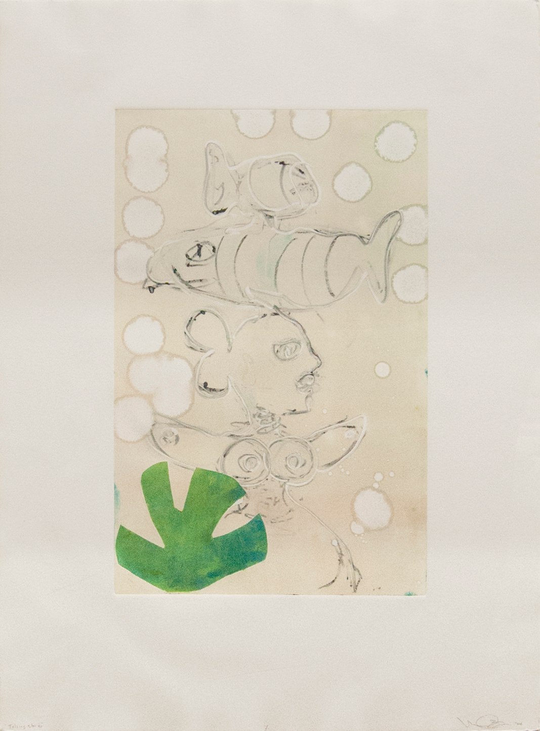 A portrait of a stylized female figure whose head is in profile and torso front facing. The figure has large exposed breast, but is wearing a hoopskirt like bottom. Her hair is styled to mimic the tail fins of the z fish that are stacked above her head. Additionally, the figures arms are fin like, instead of human. In the left corner is a solid green tropical leaf. The background is a pale yellow-gray with circular areas in which the paint was removed via the drips of an aqueous substance.