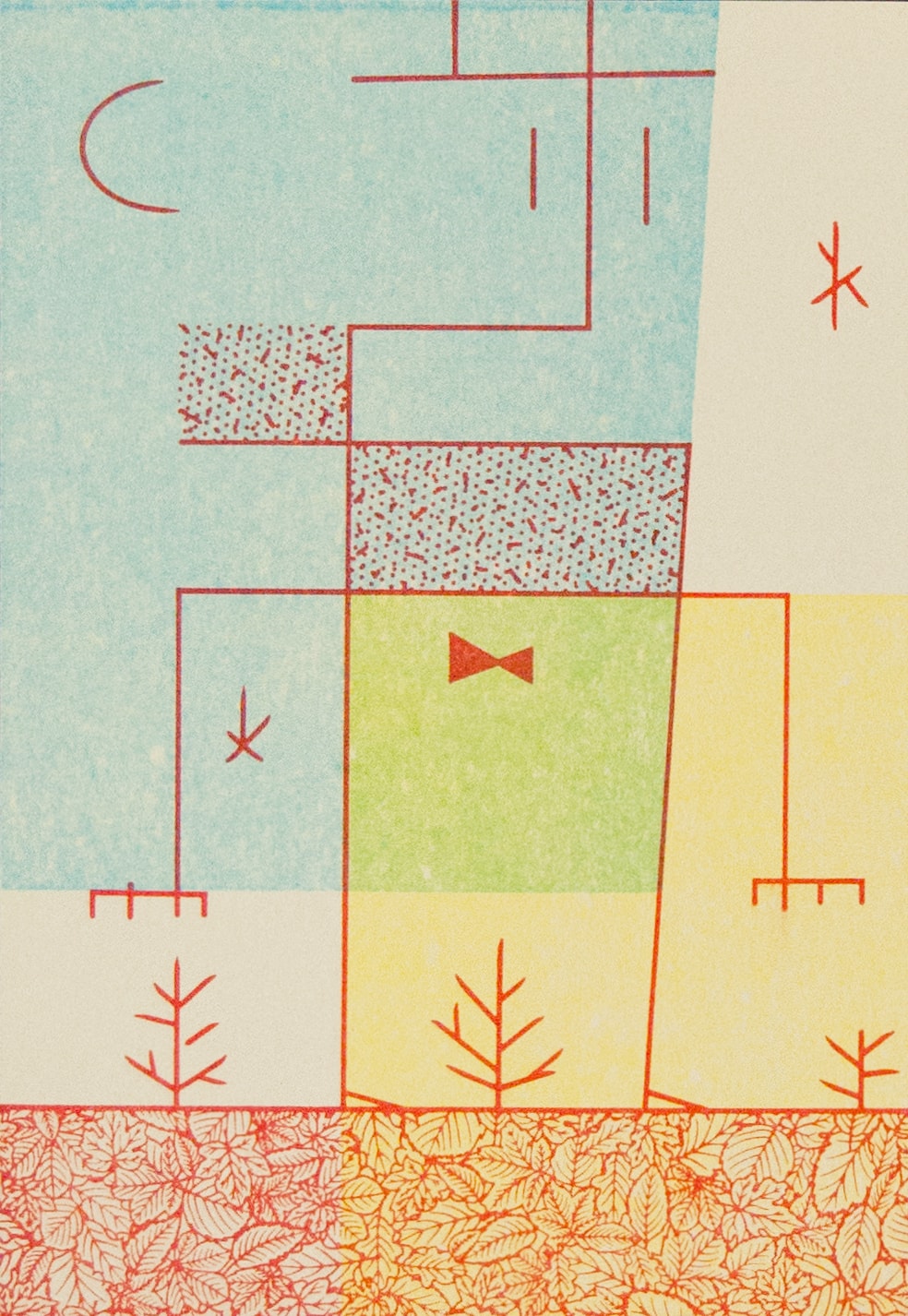 Recto: Colors: blue, yellow, green, red. Colors and red lines are used to create an abstract figure. The bottom depicts foliage. Verso: Information about the artist, print, and image is given.