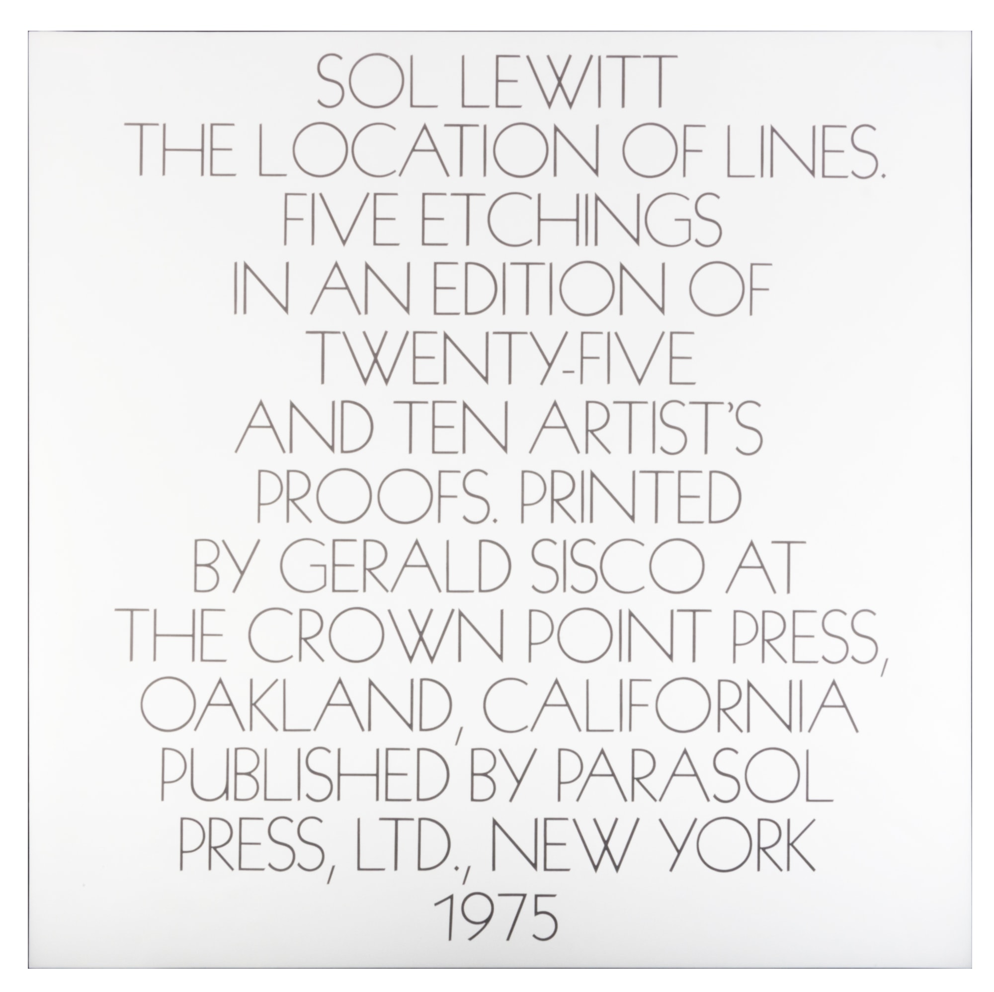 Black text on off-white paper that reads" Sol LeWitt the Location of Lines. Five etchings in an edition of twenty-five and ten artist's proofs. Printed by Gerald Sisco at the Crown Royal Oress, Oakland, California published by parasol press, LTD., New York 1975".