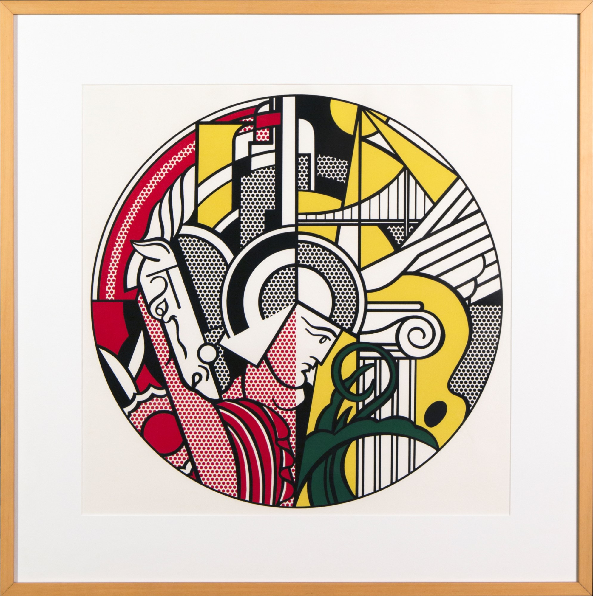 Art-deco style composition that includes the following images: a profile of a Neo-classic helmeted soldier, a horse an Ionic column, acanthus leaves, a palette, and suspension bridge. The composition is confined to a circle, with a black border.