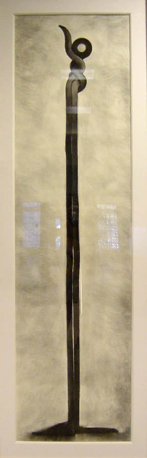 Two vertical, linear, rope like shapes, extending from feet like bases. The bottom ends of the lines are curling clockwise. The top ends are curling away from each other and into themselves.