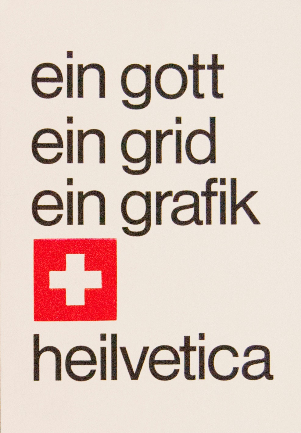 Recto: 3 lines of text, an image of the Swiss flag followed by a line of text. Verso: text provides info about the text used "Helvetica" Colors: black and red on white paper.