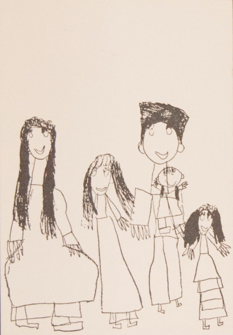 A postcard w/a reproduction of Esther K Smith and Dikko Faust's young daughter, Georgia Luna's drawing of the family. The drawing includes the mother, father and three children. According to the text on the postcard, the font used was Bernhard Modern and Grecotypes. Verso: Text includes info about the title of the piece, reproduction info PPP info an a reproduction of the daughter's signature