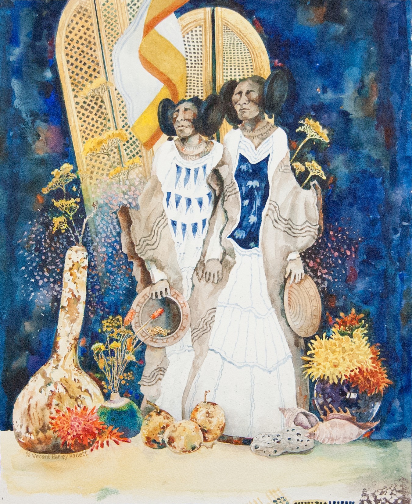 2 ceramic Native American women w/ large hair buns (hopi style) and gourds in foreground. Painted in vivid blues and yellows.