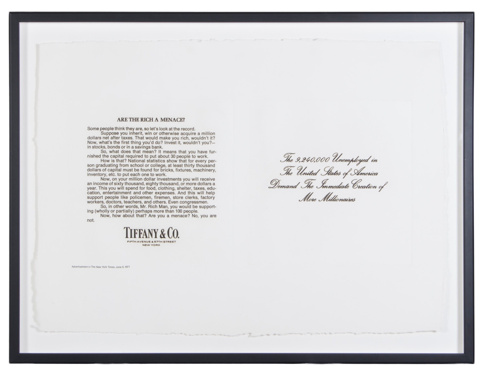 A large black-and-white print, from two large plates, with text of a mock/ satirical advertisement designed to appear as if it was printed in the New York Times by Tiffany and Co. Entitled "Are the Rich A Menace?"