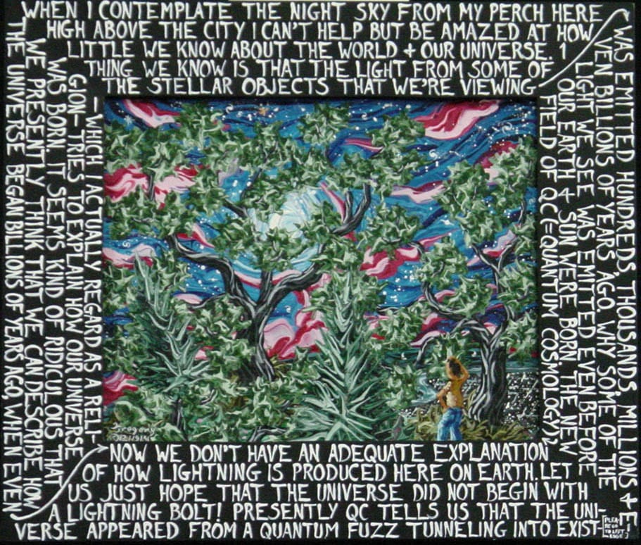 Landscape scene of a figurative abstract forest and a loan figure overlooking a city in a luminous night. The frame is covered with hand written text painted in white. Some text is painted backwards to be view with a mirror.