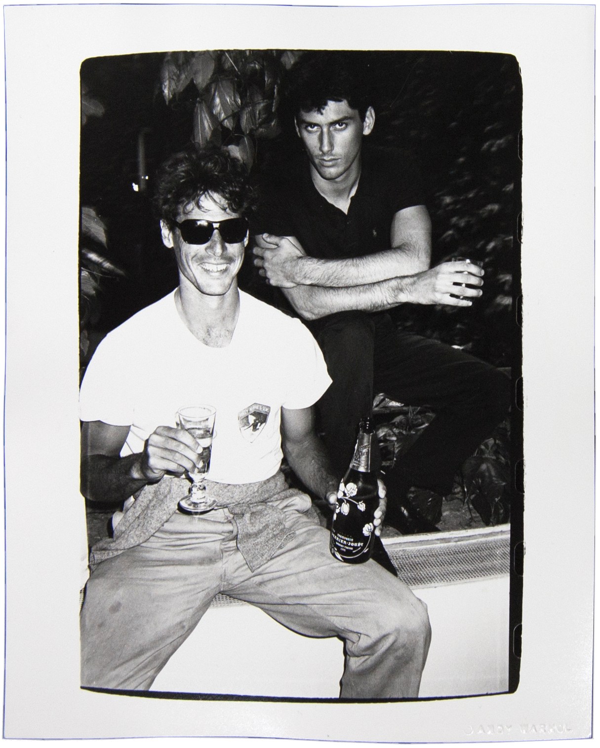 Black-and- white image, uneven masking line, contrasty, of two unidentified male models. The man on the viewer's right side is wearing jeans, a T-shirt, and sunglasses. He is hold a bottle of 1976 Perrier-Jouet Champagne. Crouched behind him, with his arm propped, across his legs, is a man in black pants and polo shirt. The sprocket holes of the film are visible on the right side of the composition.