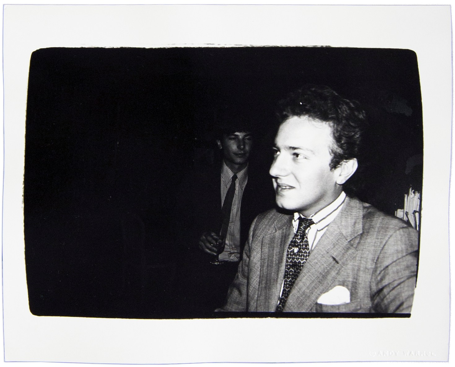Black-and-white image, uneven masking line, candid image of 3/4 bust composition of an unidentified man located in the right corner of the composition. The man has curly, short cut hair and is wearing a suit and tie. The background is dark, but another man in a suit and tie and holding a drink, can be seen.