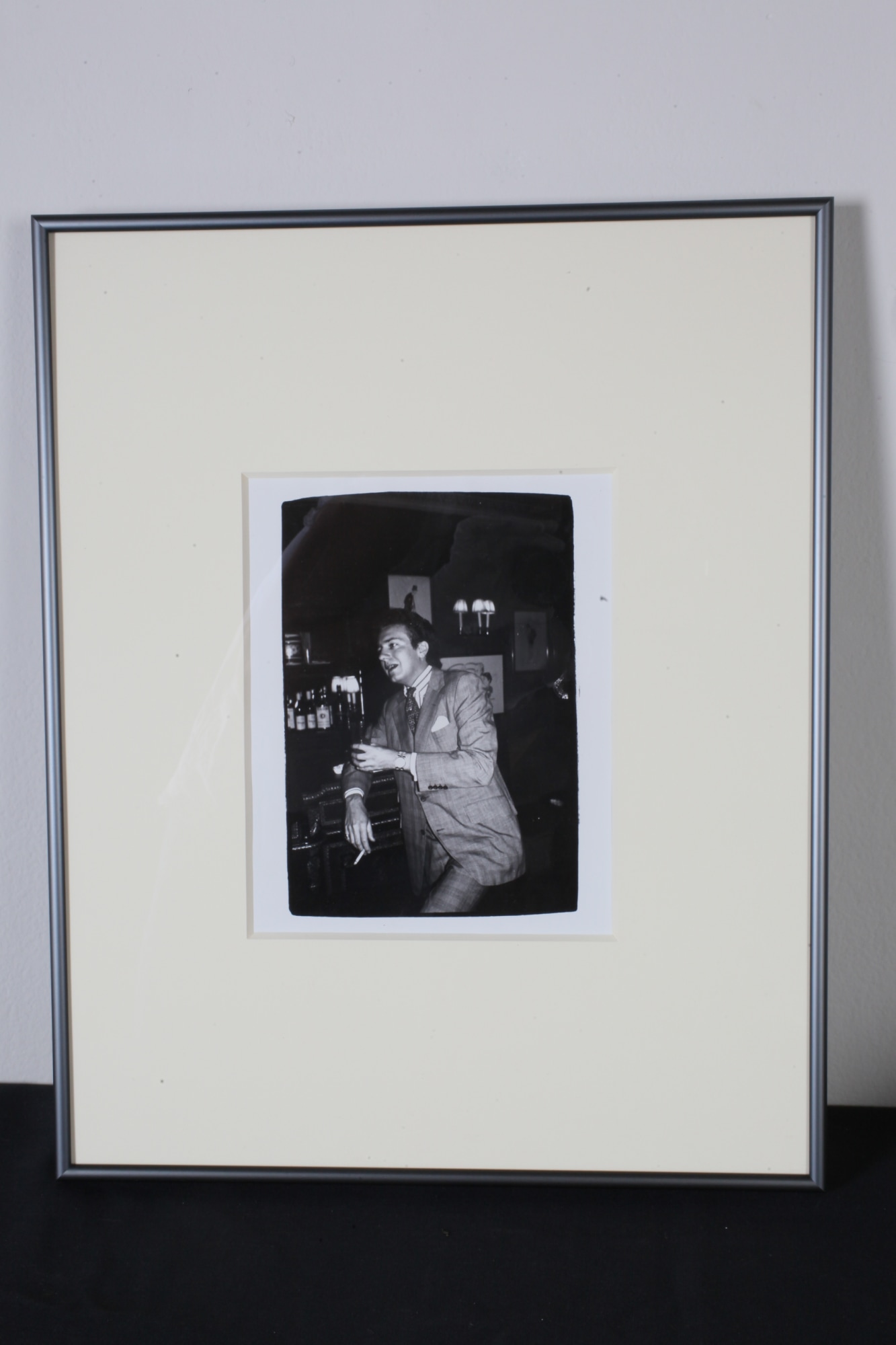 Black-and-white print photograph of a man in a suit talking with a drink and cigarette in hand. Leaning up against a bar.