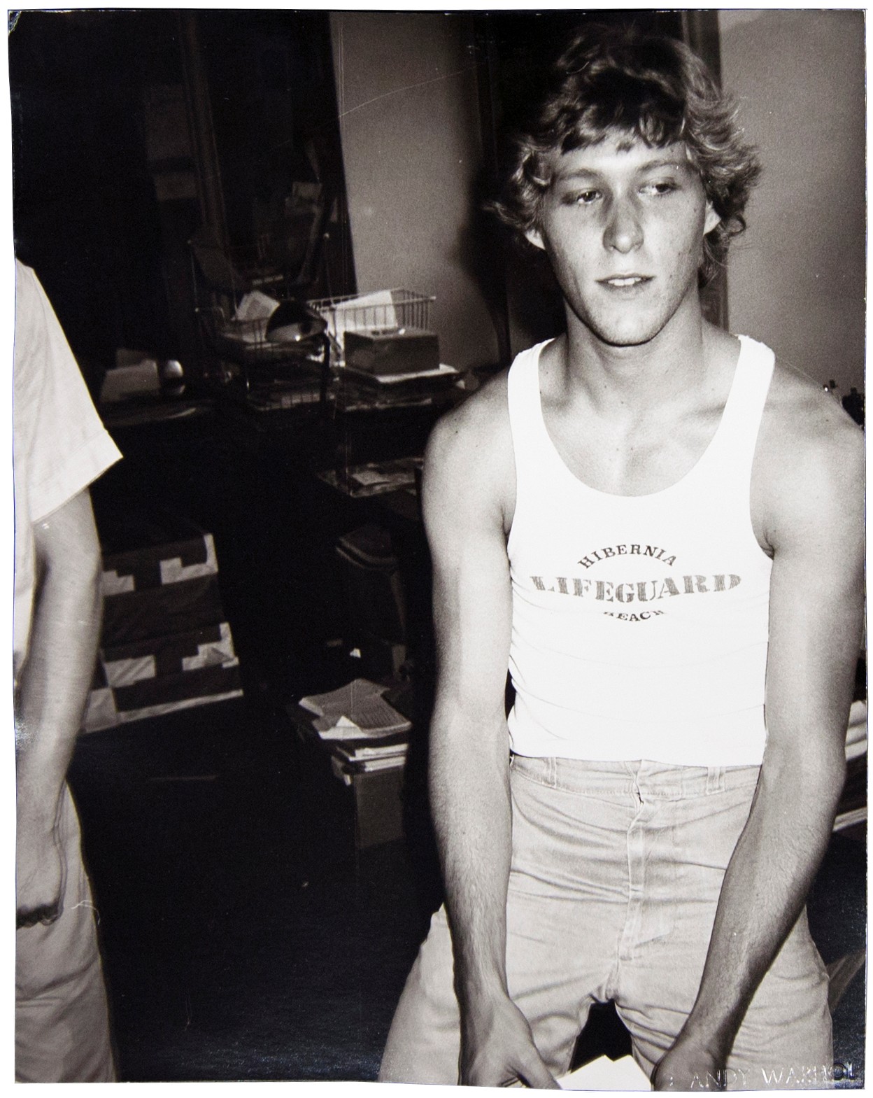 Black-and-white, borderless candid image of a young man with shaggy curly hair. He's sitting casually on the edge of a table holding onto some paper. He is looking left. He is wearing a white tank top that reads" Hibernia Beach Lifeguard". The background is an office.