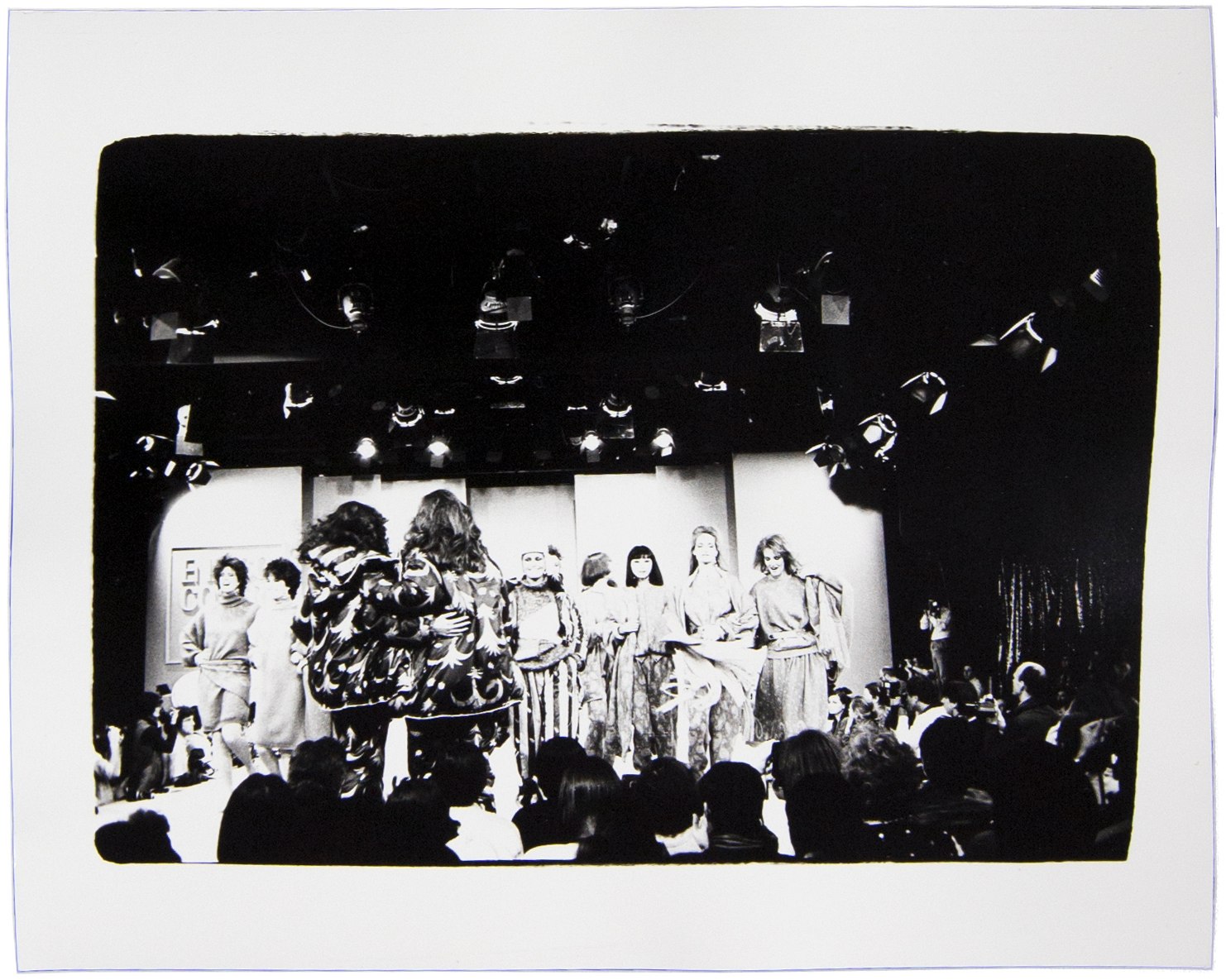 Black-and-white candid image, uneven masking line, of a group of women lined up on a on a stage and the backsides of an audience.