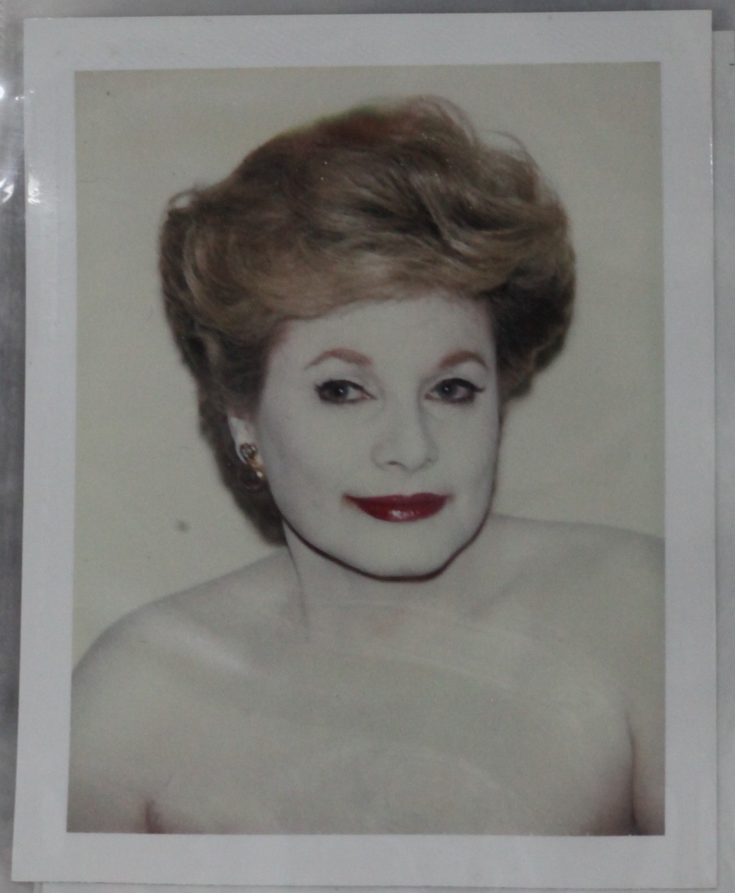 3/4, color bust portrait of an unidentified woman facing proper right. She has short dirty blond hair hair that's styled with brushed out curls. She is wearing jewel earrings, white makeup, red lipstick, and a white tube top that is barely visible. She is set against a solid off-white background.